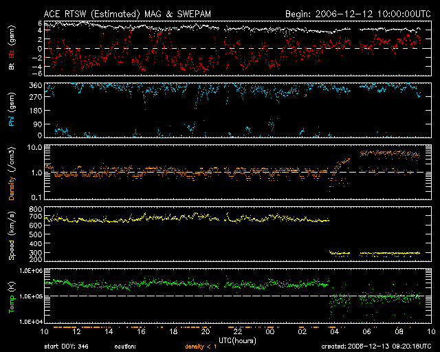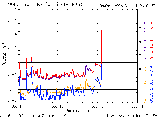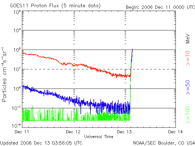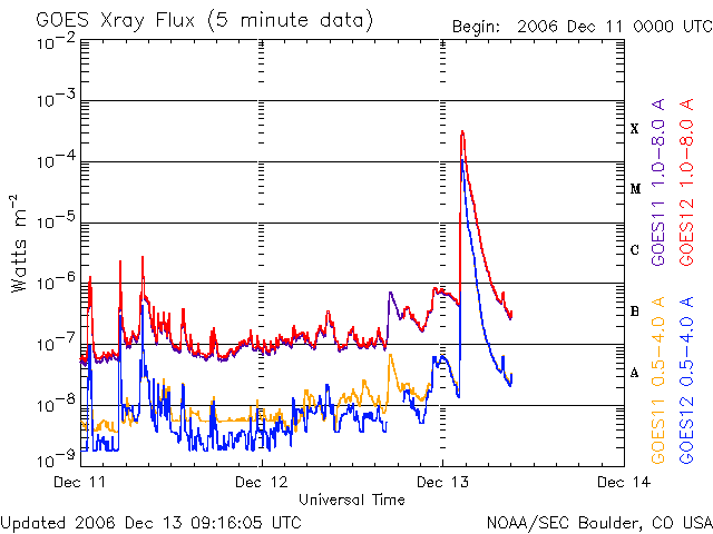 2006/12/13 11:55 更新 [速報] 13日11時半(世界時13日2時半)に、X3.3の大規模フレアが発生しました。 2006/12/13 12:58 追加 [追加情報] 太陽放射線が急激に増加しています。100PFUを超えつつあります。 2006/12/13 18:21 追加 [追加情報] 太陽放射線が600PFUに強まっています。明日以降、太陽風の乱れに注意が必要です。 担当 篠原 13日11時半(世界時13日2時半)に、X3.3の大規模フレアが発生しました。 930黒点群で発生したと思われます。 930黒点群は、黒点の面積が広がり、X線の強度も上がるなど、 活動を強める兆しを見せていましたが、 一気に大規模フレアの発生となりました。 930黒点群の大規模フレアとしては、7日3時半(世界時6日18時半)のX6.5以来です。 太陽の側面で発生した前回と異なり、 今回は太陽の中心で起こっていますので、地球への影響はより大きくなると思われます。 太陽放射線が激しく増加したり、 高速太陽風が地球に当たり、磁気嵐やオーロラの激しい活動をもたらす可能性があります。 今後の宇宙天気情報に注意してください。 今日の詳しい宇宙天気ニュースは、今朝の号をごらん下さい。 2006/12/13 12:58 追加 (篠原) 関連の図はページの最後にあります 大規模フレアに続いて、太陽放射線(太陽から飛んで来る非常に高速のプロトン粒子)が 急激に増加を開始しています。 警戒レベルは10PFUと言われていますが、 既に100PFUに達し、更に増加を続けています。 衛星の運用では、注意が必要な状態になっています。 下に掲載している図は、13日13時(世界時13日4時)の時点です。 刻々と状況が変わって行くと思います。 GOESの最新データに注目してください。 また、現在のX線の図も掲載します。 フレアで増加した様子が、だいぶ分かるようになってきました。 2006/12/13 18:21 追加 (篠原) 関連の図はページの最後にあります 太陽放射線は、引き続き増加して600PFUに達しています。 増加の速度は鈍ってきましたが、まだ増え続ける可能性があります。 たいへん強まっていますので、注意が必要です。 太陽のフレア活動は、X3.4以降は目立った活動は起こしていません。 しかし、活動的な状態が続く可能性は十分ありますので、 引き続き監視する必要があるでしょう。 太陽放射線が増加した影響で、ACEの太陽風速度の観測ができなくなっています。 太陽風磁場のデータはほとんど安定していますので、 高速風の状態が続いているのだろうと思います。 明日の午後以降、明後日にかけて、 CMEによる高速の太陽風が地球に飛んで来ると思われます。 到来が早いほど、速度が速く、磁気圏に大きな影響を及ぼすことになります。 到来が遅ければ速度は遅めなので、大きな乱れは起きにくくなります。 どのような展開になるのか、注目されます。 GOES衛星の太陽X線データ (c) NOAA/SEC ![]() 2006/12/13 12:58 追加 GOES衛星の太陽放射線データ (c) NOAA/SEC ![]() GOES衛星の太陽X線データ (c) NOAA/SEC ![]() SOHO衛星のMDIカメラによる太陽黒点 (c) SOHO (ESA & NASA) ![]() 2006/12/13 18:21 追加 GOES衛星の太陽放射線データ (c) NOAA/SEC ![]() GOES衛星の太陽X線データ (c) NOAA/SEC ![]() ACEが観測した太陽風の磁場(1番上の枠、白線は全体の強度、赤線は南北成分) および、太陽風の密度(3番目の橙線)、速度(4番目の黄線) (c) NOAA/SEC ![]() | |||||||||||||||||||||||||||||||||||||||