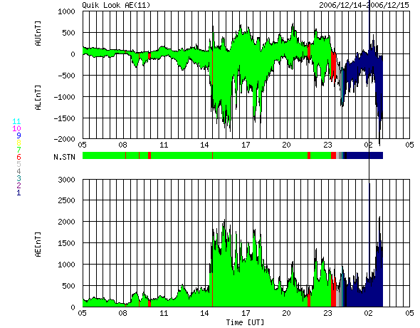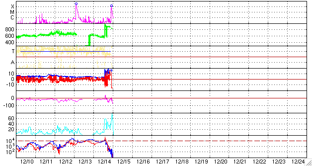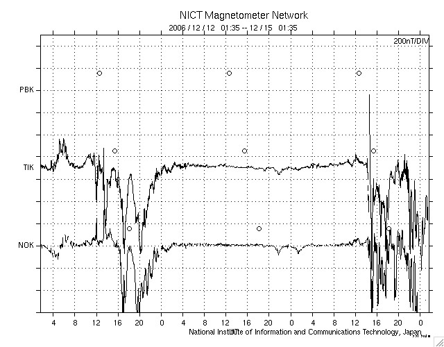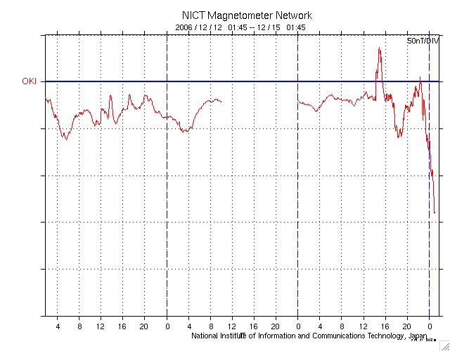 ACEが観測した太陽風の磁場(1番上の枠、白線は全体の強度、赤線は南北成分) および、太陽風の密度(3番目の橙線)、速度(4番目の黄線) (c) NOAA/SEC ![]() リアルタイムAE指数 下段のAEグラフの値が高くなると、オーロラ活動が活発化しています。 (c) 京都大学, NICT ![]() 沖縄の磁場擾乱 下へ下がるほど、擾乱が発達している事を意味します。 (c) NICT ![]() シベリアで観測された3日間の磁場データ 右側の3分の1が、昨日のデータになります。グラフが上がったり下がったりすると、オーロラ活動が活発化しています。 (c) NICT ![]() 27日の太陽周期に合わせたデータプロット 太陽が同じ面を地球に向けていた27日前の変化から、今後を予想することができます。 (c) NICT