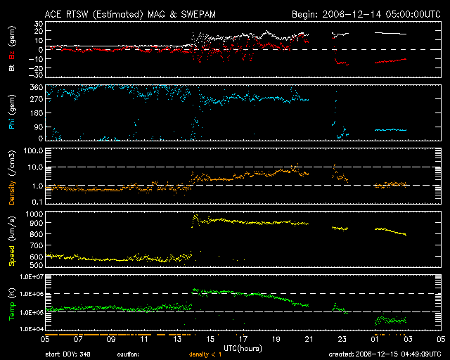 2006/12/15 13:51 更新 900km/秒の非常に高速の太陽風が到来しました。その後、磁場が大きく南を向き、磁気嵐が大きく発達しています。 担当 篠原 13日のX3.4大規模フレアによる高速の太陽風が、昨夜地球にやってきました。 ACE衛星の図を見て下さい。 14日23時(世界時14日14時)に、速度が600km/秒から一気に950km/秒へ増加しています。 かなりの高速風です。 速度は900km/秒で落ち着き、その後もずっと大変高速の状態が続いています。 現在は800km/秒に下がっています。 それでも、依然かなりの高速状態です。 一方、太陽風の磁場は、15〜20nTへかなり強まりました。 ただ、非常に強いというほどの増加ではありませんでした。 磁気圏擾乱に影響が大きい南北成分は、 初めは-15nTと0nTの間を振動する様な変化が4時間ほど続きました。 この影響で、極域で激しいオーロラ活動が発生しています。 AE指数では、2000nTに達する変動が記録されています。 北極では、かなり活発なオーロラが見えていたのではないでしょうか。 その後、太陽風の磁場は一旦北寄りになります。 しかし、15日7時半(世界時14日22時半)に、急に南寄りに切り替わります。 -15nTの強い南向きになり、そのままずっと南向きで固定された様になっています。 振幅としては次第に弱まって、現在は-10nT(十分大きな値です)になっています。 この変化によって、磁気圏の赤道に流れる環電流が急激に発達を始めました。 沖縄の磁場データでは、図の最後の部分で、 静穏レベルの青線から、一気に-150nTの減少が見られています。 大規模な磁気嵐が発生しているようです。 この時の沖縄は、時間的には一番変化が小幅になる位置にありましたので、 世界規模で測定すると、より大きな変動である可能性があります。 太陽風磁場は現在も強い南向きを保っているので、 磁気嵐はもう一段発達していくかもしれません。 AE指数はデータが止まっているため、この時間帯の変化は現時点では分かりません。 ただし、この規模の擾乱になると、 オーロラ帯が通常よりもずっと低緯度側に広がってしまい、 AE指数によって正確なオーロラ活動を測る事は難しくなります。 参考にシベリアの磁場データを掲載します。 1000nT規模の変動が観測されています。 さて、太陽風は現在もたいへん高速です。 しかし、コロナホールと違って、CMEの高速風は長時間続くものではありませんから、 この後はゆっくりと低下に向かうと思います。 南向き磁場も次第に振幅が落ちてきていて、 これから数時間ほどで0nT近くまで弱まりそうです。 磁気圏の大規模な乱れは、今日いっぱいは続きそうですが、 明日にかけて規模が次第に弱まって行くでしょう。 13日に起こった大規模フレアについては、このような展開が予想されますが、 今朝、930黒点群が再び大規模フレアを起こしました。 今度は、だいぶ小さくなっていて、X1.5とやっと大規模フレアになったくらいです。 発生時刻は15日7時(世界時14日21時)です。 まだSOHOの画像がありませんが、規模から考えて、 CME(太陽ガスの放出現象)が発生していると思われます。 ただ、930黒点群がだいぶ西に傾いてきているので(SOHO EIT284の写真を参照)、 地球への影響は小さめになるでしょう。 フレアとしての規模と位置的な問題から、 現在来ているほどの大きな太陽風の乱れが来ることはないだろうと思います。 ただし、ここで注意が必要なことは、磁気圏への影響を決めるのは、 速度だけではなく、磁場の強さ・向きも鍵を握っているということです。 速度はそれほどでなくても、磁場が強く南を向いて激しい磁気嵐が起こることもあります。 ですので、次の高速太陽風も到来後のデータに注意する必要があります。 高速風の到来は、16日の夜から17日にかけてだと思います。 最後に、930黒点群は依然大きな規模と、磁気的な複雑さを保っています。 今朝の大規模フレアで勢力がどうなるかが注目されますが、 引き続き注意を払う必要があるでしょう。 今日の更新が遅くなり、申し訳ありませんでした。 以後は、状況の進展に従って適宜更新を行います。 SOHO衛星のEIT284カメラの映像 (c) SOHO (ESA & NASA)