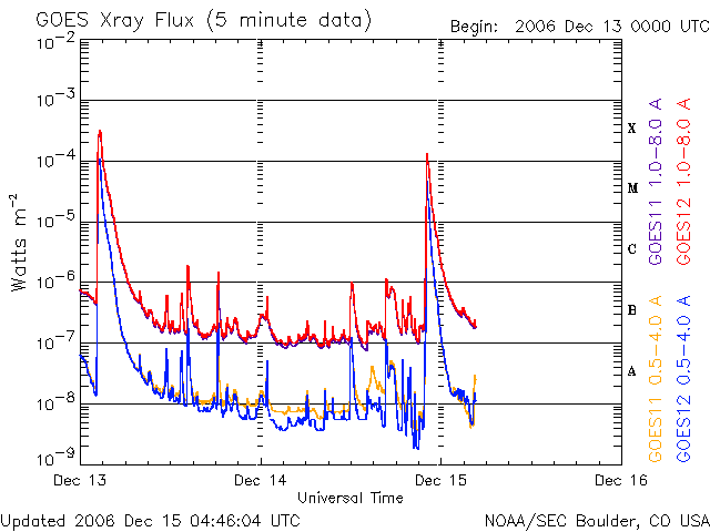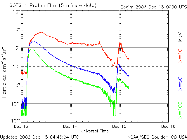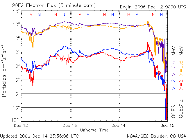 (c) NOAA/SEC ![]() SOHO衛星のMDIカメラによる太陽黒点 (c) SOHO (ESA & NASA) ![]() GOES衛星の太陽放射線データ (c) NOAA/SEC ![]() GOES衛星による、静止衛星軌道における高エネルギー電子の変化 (c) NOAA/SEC ![]() | ||||||||||||||||||||||||||||||||||||||||||||||||||||||||||||