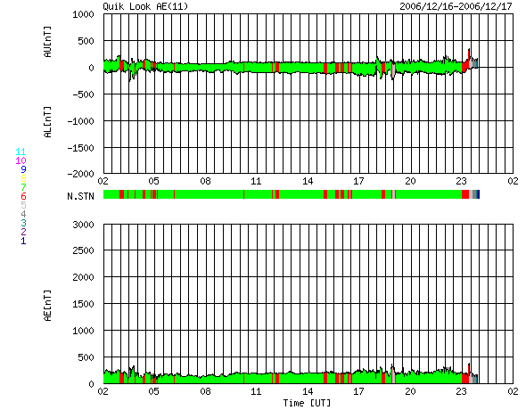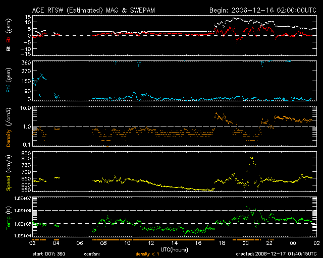 2006/12/17 10:41 更新 CMEによる高速の太陽風が来ました。速度はそれほど高くなく(650km/秒)、北寄りの磁場のため、磁気圏は穏やかです。 担当 篠原 昨夜、17日2時半(世界時16日17時半)頃、ACE衛星で次の高速太陽風の到来が観測されました。 15日7時(世界時14日21時)のX1.5大規模フレアの影響によるものです。 ただ、今回はそれほど大きな乱れではなく、 速度は650km/秒に強まっただけでした (細かく見ると、その後、瞬間的に800km/秒へ上昇する変化が見られています)。 磁場強度は10〜15nTに強まりました。 こちらもたいへん強いという様な強度ではありません。 今回、フレアの発生から高速風の到来まで、約43時間かかりました。 2日かからなかったにしては、650km/秒という速度はやや遅めだったと感じます。 14日の高速風はフレア発生から約35時間後に到来し、速度は900km/秒に上昇しました。 太陽風の伝播には様々な要因が関わるので、 単純に速度と時間だけで比較する事はできませんが、 前回と今回とでは条件に何か違いがあったのでしょう。 さて、太陽風磁場は強まったものの、 これまでは北寄りに推移しています。 また、強さは+5nT程度で、大きく強まる事もありませんでした。 そのため、高速風到来後の磁気圏への影響は小さく、 AE指数はほとんど変化がありません。 シベリア磁場データを見ると、14日の大きな変化と比べ、 今回(右側3分の1)は、瞬間的な変化(太陽風の速度上昇の瞬間の変化)があるだけで、 その他はとても穏やかです。 沖縄の磁場データも順調に静穏レベルへと回復しつつあります。 太陽風は現在も650km/秒を保っています。 磁場強度は5nTに下がり、通常レベルです。 高速風は長時間は続かず、やがて下がり始めるでしょう。 下がりきるまでは、磁場が南寄りに変わった場合は、 ある程度のオーロラ活動が期待できます。 930黒点群はだいぶ西に傾いてきました。 規模はまだ保っている様ですが、 地球へ影響を及ぼす可能性はだいぶ小さくなっています。 X線のグラフを見ると、X1.5のフレア以降は目立ったフレア活動は起こしていません。 X線の強度も弱まっていく傾向が見られ、 活動度は下がりつつあるのではないでしょうか。 ただ、引き続き注目を続ける必要はあるでしょう。 今日は、1枚目の写真でSOHO EIT284の写真を掲載しています。 いつものサイトの写真更新がまだでしたので、違うところから参照しています。 12月5日以降は、大規模フレアや磁気嵐の騒動でたいへんでしたが、 その間に、次のコロナホールが太陽の中心に来ています。 コロナホールとは、太陽の磁場が外側へ向かって開いている場所で、 ここから速度の高い太陽風が、太陽系へ向かって吹き出しています。 EIT284の写真で、太陽の中心からやや南寄り(下寄り)に見えている暗い影の部分です。 「お祭りのあとの日常」という感じもありますが、 コロナホールが中心線に達していますので、 これから3日後の、12月20日頃に地球に高速風がやってきそうです。 27日周期の図を見ると、前周期も11月23日に高速風がやってきています。 この高速風帯の回帰です(1周期(27日)後が12月20日)。 前回は、600km/秒を超えるくらいの立派な高速風が来ていますので、 今回もどのような変化になるか、注目されます。 放射線帯の高エネルギー電子が高いレベルを保っています。 10,000の線を大きく超えて、昨日より40,000のレベルが続いています。 衛星の運用では障害が発生しやすい状況にありますので、 注意が必要でしょう。 一方、太陽放射線はすっかり強度が下がり、 通常の状態に戻りつつあります(まだ少し高めです)。 SOHO EIT284の太陽写真。17日7時(世界時16日22時)。 (c) ESA & NASA ![]() ACEが観測した太陽風の磁場(1番上の枠、白線は全体の強度、赤線は南北成分) および、太陽風の密度(3番目の橙線)、速度(4番目の黄線) (c) NOAA/SEC ![]() リアルタイムAE指数 下段のAEグラフの値が高くなると、オーロラ活動が活発化しています。 (c) 京都大学, NICT ![]() シベリアで観測された3日間の磁場データ 右側の3分の1が、昨日のデータになります。グラフが上がったり下がったりすると、オーロラ活動が活発化しています。 (c) NICT ![]() 沖縄の磁場擾乱 下へ下がるほど、擾乱が発達している事を意味します。 (c) NICT ![]() SOHO衛星のMDIカメラによる太陽黒点 (c) SOHO (ESA & NASA) ![]() GOES衛星の太陽X線データ (c) NOAA/SEC ![]() 27日の太陽周期に合わせたデータプロット 太陽が同じ面を地球に向けていた27日前の変化から、今後を予想することができます。 (c) NICT