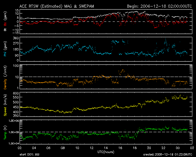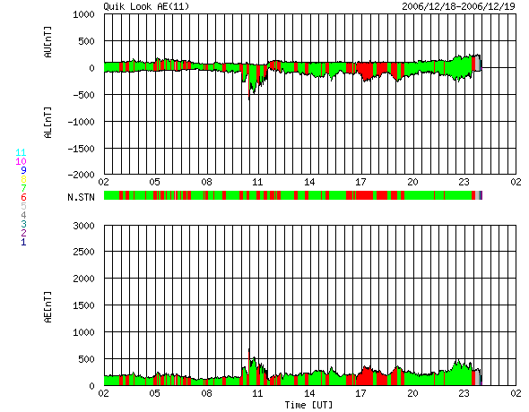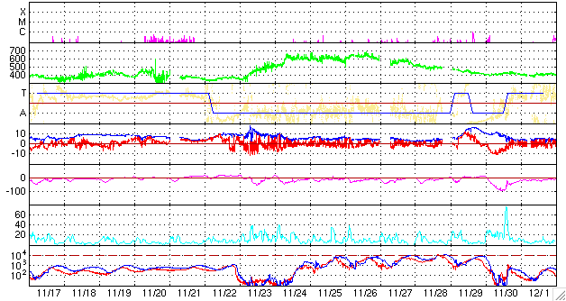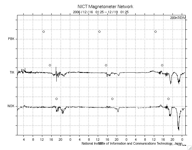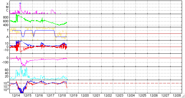 ACEが観測した太陽風の磁場(1番上の枠、白線は全体の強度、赤線は南北成分) および、太陽風の密度(3番目の橙線)、速度(4番目の黄線) (c) NOAA/SEC ![]() リアルタイムAE指数 下段のAEグラフの値が高くなると、オーロラ活動が活発化しています。 (c) 京都大学, NICT ![]() シベリアで観測された3日間の磁場データ 右側の3分の1が、昨日のデータになります。グラフが上がったり下がったりすると、オーロラ活動が活発化しています。 (c) NICT ![]() 27日の太陽周期に合わせたデータプロット 太陽が同じ面を地球に向けていた27日前の変化から、今後を予想することができます。 (c) NICT
