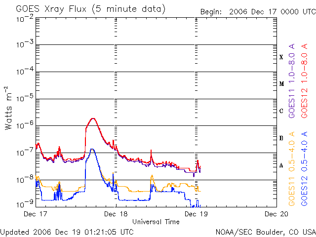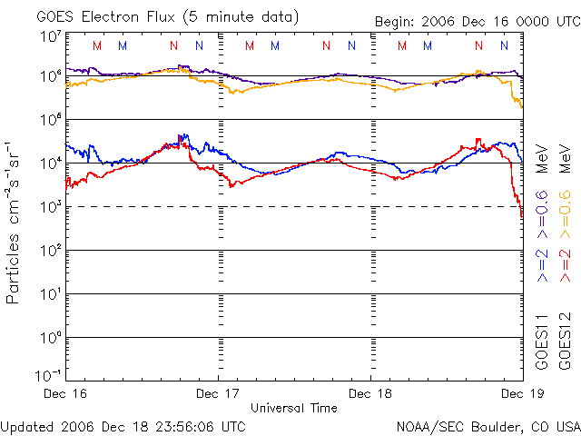 (c) SOHO (ESA & NASA) ![]() GOES衛星の太陽X線データ (c) NOAA/SEC ![]() GOES衛星による、静止衛星軌道における高エネルギー電子の変化 (c) NOAA/SEC ![]() | |||||||||||||||||||||||||||||||||||||||||||||||||||||||||||||