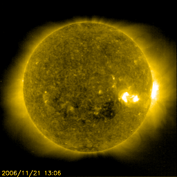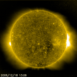 2006/12/19 10:24 更新 太陽風の速度が上昇しています(550km/秒)。太陽は無黒点になりました。 担当 篠原 太陽風の速度が上昇しています。 ACE衛星の観測によると、18日18時(世界時18日9時)から、 太陽風の速度、磁場強度の増加が始まっています。 速度は400km/秒くらいに下がっていましたが、 それから半日ほどかけて、現在は550km/秒に上昇しています。 一方、磁場強度は、それまでの3nTから、 8時間ほどで10nTを超える程度に強まりました。 そこでピークを迎え、現在は5nTくらいに弱まっています。 磁場強度が落ちたということで、 速度の上昇は、このあたりで一段落しそうです。 SOHO EIT284の太陽写真を見ると(左側が最新です)、コロナホール (かなり淡いですが、南寄りやや西(下寄りやや右)に見える暗い領域です)は、 まだ大きくは西に進んでおらず、この影響が地球に及ぶにはやや早い感じがします。 ちなみに、27日前の前周期の写真(右側)と比較すると、 コロナホールの位置に大きな違いはありません。 そして、27日周期の図で速度の変化を見ると、 前周期は11月23日から本格的な上昇を始めていて(今周期では12月20日に相当します)、 12月18日の上昇はだいぶ早まっていることになります。 以上のことから、現在の乱れは、もう少し規模の小さな変動で、 コロナホールの本格的な影響は、これから改めて始まるのではないかと思います。 これから明日にかけての、太陽風の変化に注目してください。 前周期の高速風は、最高が650km/秒を超えるほどになり、 6日にわたって高速風が続く、かなり立派なものでした。 速度の上昇によって、オーロラ活動も発生しています。 AEデータは、観測点の数が揃っていないためか、目立った変化はありませんが、 シベリアの磁場データで、小規模の変動が記録されています。 速度が高まっていますので、今後も同じ様な状況が続くでしょう。 ただし、磁場強度は弱まっているので、大きな変動は発生しないと思います。 930黒点群が太陽の向こう側に回り、太陽は無黒点になっています。 X線の強度も一気に下がり、穏やかな太陽が帰って来ました。 放射線帯の高エネルギー電子は、 グラフとしては、昨夜まで高いレベルを保っています。 しかし、最後の部分で大きく減少を示しています。 これは、太陽風の速度が上昇して、磁気圏がやや活動的になった影響だと思われます。 今日のピークでは、だいぶ下がっているのではないでしょうか。 警戒レベル(10,000の線)を割っている可能性もあります。 SOHO衛星のEIT284カメラの映像 (c) SOHO (ESA & NASA)