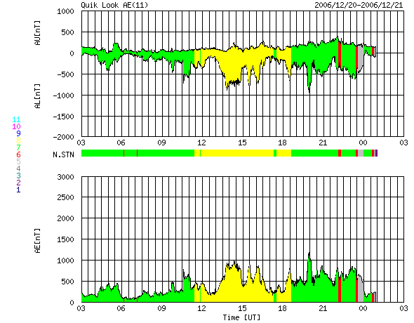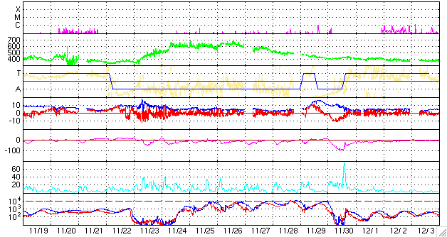 ACEが観測した太陽風の磁場(1番上の枠、白線は全体の強度、赤線は南北成分) および、太陽風の密度(3番目の橙線)、速度(4番目の黄線) (c) NOAA/SEC ![]() リアルタイムAE指数 下段のAEグラフの値が高くなると、オーロラ活動が活発化しています。 (c) 京都大学, NICT ![]() 27日の太陽周期に合わせたデータプロット 太陽が同じ面を地球に向けていた27日前の変化から、今後を予想することができます。 (c) NICT
