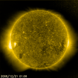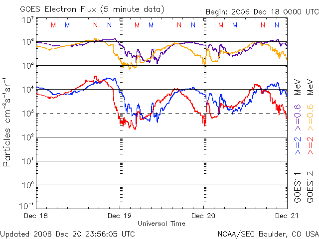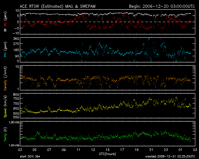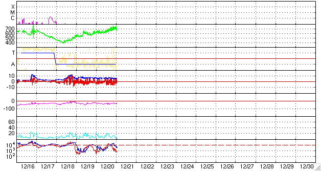 2006/12/21 11:27 更新 太陽風は更に速度が上がっています(700km/秒)。活発なオーロラ活動が続いています。 担当 篠原 アクセス累計100万件を記念して、これまでの経過をまとめました。 「宇宙天気ニュース100万カウント達成」 どうぞご覧下さい。 高速の太陽風が続いています。 昨日は600km/秒でしたが、その後ゆっくりと上昇の傾向が続き、 現在は700km/秒前後で推移しています。 かなり高速になっています。 27日周期の図を見ても、前周期が600km/秒台に留まっていたのに比べ、 今回はもう一段高まっているのが分かります。 SOHO EIT284の太陽写真で、コロナホールは西へやや進んでいますが、 横幅が広く、東の端(左端)はちょうど太陽の中心線に達したくらいです。 このため、太陽風の高速状態は、これから4日程度は続くのではないかと思われます。 速度としては、現在くらいが最高速なのではないでしょうか。 太陽風の磁場強度は6nTでほぼ安定しています。 南北成分は、+5nTから-5nTの間で、南北に細かく変動しています。 このため、オーロラ活動が活発になっています。 AE指数では、800〜1000nTの中規模の活動が何度も観測されています。 北極域では、にぎやかなオーロラを楽しんでいることでしょう。 高速風が続いていますので、今後も活発なオーロラ活動が期待されます。 ただし、高速風も後半になると、磁場強度が下がり、 南向き磁場も弱まって行きます。 そうなると、オーロラ活動の規模は次第に弱まって行きます。 放射線帯の高エネルギー電子が、10000の警戒レベルを保っています。 やや増加の兆しも見えています。 高速風が続いているので、これから更に増加するのではないかと思います。 しばらく注視する必要があるでしょう。 太陽は無黒点のままです。 X線強度も最低レベルで、非常に穏やかです。 先週の騒ぎがうその様です。 SOHO衛星のEIT284カメラの映像 (c) SOHO (ESA & NASA)