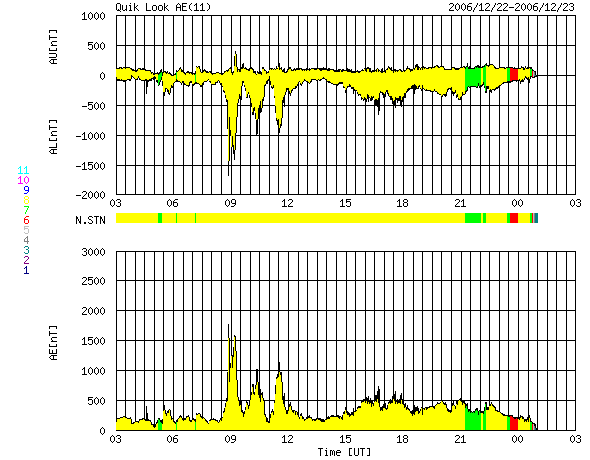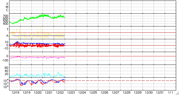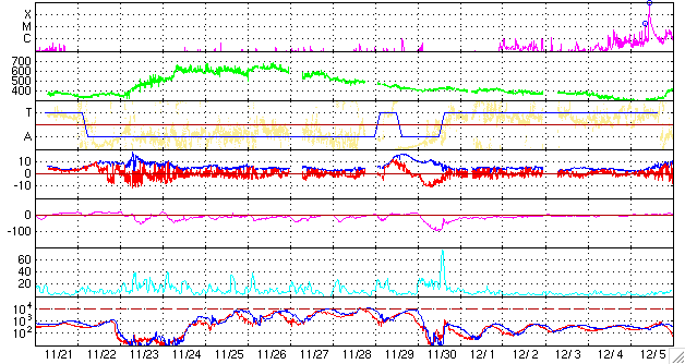ACEが観測した太陽風の磁場(1番上の枠、白線は全体の強度、赤線は南北成分) および、太陽風の密度(3番目の橙線)、速度(4番目の黄線) (c) NOAA/SEC ![]() リアルタイムAE指数 下段のAEグラフの値が高くなると、オーロラ活動が活発化しています。 (c) 京都大学, NICT ![]() 27日の太陽周期に合わせたデータプロット 太陽が同じ面を地球に向けていた27日前の変化から、今後を予想することができます。 (c) NICT