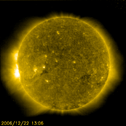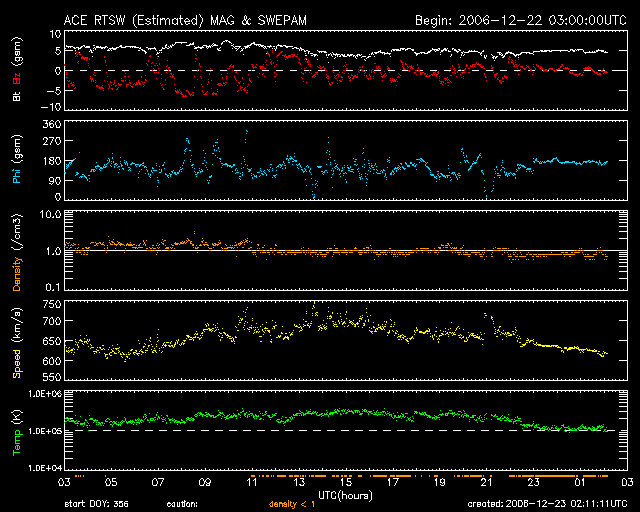 2006/12/23 11:13 更新 太陽風はかなり高速の状態を保っています。現在は620km/秒です。オーロラも活発です。 担当 篠原 高速の太陽風が続いています。 昨日のニュース以降太陽風の速度は、 650km/秒から一旦700km/秒にあがり、その後またやや下がって650km/秒にもどる という変化をしました。 現在はもう少し下がって、620km/秒くらいになっています。 全体的にかなり高速の状態が続いています。 磁場強度は5nTでほぼ安定しています。 南北成分は、ACEの図の前半では-5nTの南向き成分がひんぱんに見られています。 速度がかなり高まっているので、磁気圏の活動も強まると考えられます。 実際、AE指数を見ると、 図の真ん中あたりで、最大1500nTに達する大きな活動が記録されています。 極域ではかなり活発なオーロラを見ることができたのではないでしょうか。 一方、ACEの図の後半では、磁場の南向きは小さくなっています。 エネルギーの流れ込みが減少し、それとともにAE指数の変化も小さくなっています。 それでも、速度としてはかなりの高さを保っていますので、 500nT規模の小規模の変動は続いていました。 27日周期の図を基にすると、 太陽風は今日いっぱいは、現在くらいのかなり高速の状態を保ちそうです。 そして、明日くらいから、次第に下げていくのではないでしょうか。 高速状態は、25-26日くらいまで続くと予想されます。 オーロラ活動も、次第に規模が小さくなって行きますが、 もうしばらくは活発な活動を見られそうです。 放射線帯の高エネルギー電子は安定した状態で高レベルを保っています。 目立った変化は無く、増加の傾向は示していません。 高速風が続いていることもあり、電子の数は当分の間警戒レベルを保つと予想されます。 衛星の運用では注意が必要な状態が続きます。 太陽はまだ黒点の見えない状態が続いています。 SOHOの写真では、太陽の東端(左端)が明るく見えていますが、 ここから新しい黒点群は上がってくるのでしょうか。 SOHO衛星のEIT284カメラの映像 (c) SOHO (ESA & NASA)