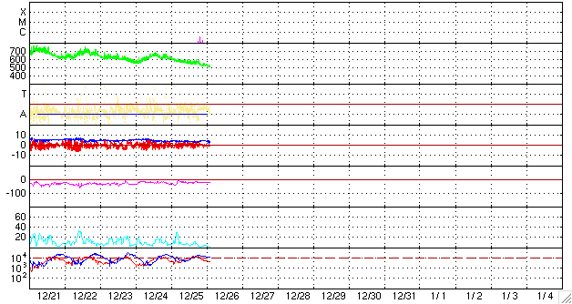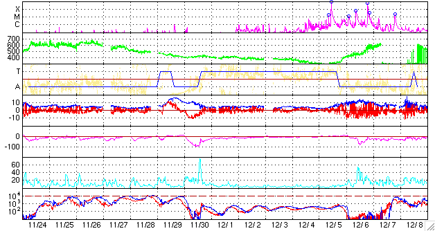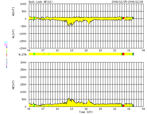 ACEが観測した太陽風の磁場(1番上の枠、白線は全体の強度、赤線は南北成分) および、太陽風の密度(3番目の橙線)、速度(4番目の黄線) (c) NOAA/SEC ![]() リアルタイムAE指数 下段のAEグラフの値が高くなると、オーロラ活動が活発化しています。 (c) 京都大学, NICT ![]() 27日の太陽周期に合わせたデータプロット 太陽が同じ面を地球に向けていた27日前の変化から、今後を予想することができます。 (c) NICT