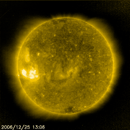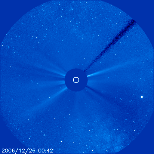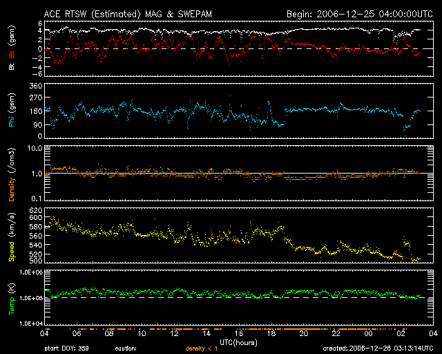 2006/12/26 12:16 更新 太陽風は速度を下げつつあります(500km/秒)。オーロラ活動は小さくなって来ています。 担当 篠原 SOHO衛星のLASCO C3カメラの中を、夏の天の川が横切りつつあります。 今日の1枚目の写真をご覧下さい。 天の川は、写真の真ん中を上から下へと流れています。 太陽の近くはやや見にくくなっていますが、 写真の上辺と下辺のあたりに、もやっと雲の様に天の川の光が見えます。 太陽は、いて座の中にあります。 ちょうど、南斗六星の柄の部分です。 写真をよく見ていると、星雲や星団なども見えています。 興味のある方は、星図と見比べてみてはいかがでしょうか。 この光景は、今週いっぱいくらい楽しめそうです。 太陽風はゆっくりと速度を下げています。 昨日の600km/秒から100km/秒ほど下げて、現在は500km/秒になりました。 普通の高速風と呼べる範囲でしょう。 27日周期の図で見ると、速度が順調に下がっている様子がより見やすくなります。 速度は引き続き、今日から明日にかけて下がって行くでしょう。 そして、地球は高速風領域を抜け出します。 その後は、低速風の穏やかな状態になるでしょう。 オーロラ活動は、小規模の変動が見られています。 AE指数で500nTくらいの規模のものです。 速度は依然高いのですが、磁場の変動が小さくなり、 南向きが-2nTくらいのものしか見られなかったためです。 今後は、速度がどんどん下がって行きますので、 オーロラ活動は更に弱まって行くでしょう。 放射線帯高エネルギー電子は、安定して警戒レベルを保っています。 27日周期の図で、過去5日分を見比べると、 1日の中の変化幅が次第に小さくなっているものの、 平均的なレベルはほとんど変わっていません。 この後も減少はゆっくりと進みますので、しばらく注意が必要な状態が続きます。 太陽面には、931, 932黒点群が発生しています。 どちらもとても小さいもので、掲載の写真ではほとんど見つけることができません (白斑とかすかな黒い点が見えている様です)。 SOHO EIT284の写真で、太陽の東側(左側)の明るくなっている部分にできています。 このうち、932黒点群がいくらか活動的とのことで、 X線のグラフでBクラスの小さな変化を起こしています。 小規模クラスのフレアを起こすかもしれないとのことです。 SOHO衛星のLASCO C3カメラで、夏の天の川が見えています。 (c) ESA & NASA ![]() SOHO衛星のEIT284カメラの映像 (c) SOHO (ESA & NASA)