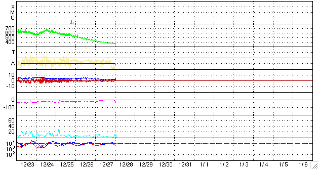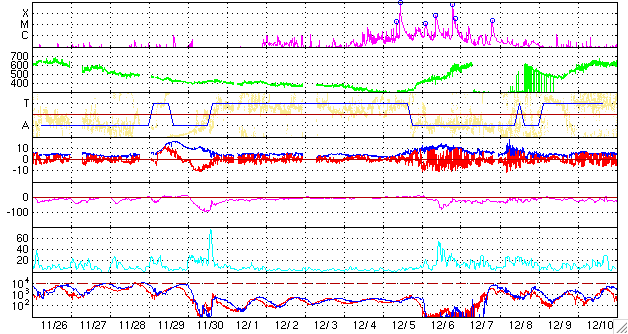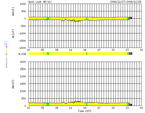 ACEが観測した太陽風の磁場(1番上の枠、白線は全体の強度、赤線は南北成分) および、太陽風の密度(3番目の橙線)、速度(4番目の黄線) (c) NOAA/SEC ![]() リアルタイムAE指数 下段のAEグラフの値が高くなると、オーロラ活動が活発化しています。 (c) 京都大学, NICT ![]() 27日の太陽周期に合わせたデータプロット 太陽が同じ面を地球に向けていた27日前の変化から、今後を予想することができます。 (c) NICT