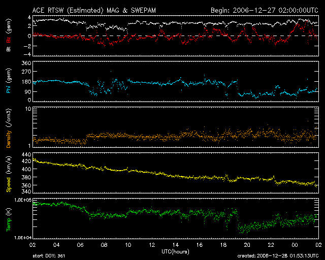 2006/12/28 10:55 更新 太陽風は低速になっています(360km/秒)。磁気圏も静穏です。 担当 篠原 太陽風は、安定したペースで速度を下げ続けています。 昨日の420km/秒から、現在は360km/秒まで下がりました。 すっかり低速風に変わっています。 太陽風の磁場強度は2〜3nTとだいぶ弱まっています。 南北成分は+2nT〜-2nTを切るくらいの小さな振幅で変化しています。 このため、オーロラの活動はすっかり穏やかになりました。 オーロラの活動を示すAE指数のグラフには、ほとんど変化が見られていません。 AE指数のグラフは、オーロラの活動に伴って電離層に流れる電流の強度を、 地上の磁場観測によって測定するものです。 オーロラが活発になると、電流が強まり、磁場強度が大きく変化します。 図が2段になっていますが、 上段は、東向き電流をプラス方向の変化として(AU側)、 西向き電流をマイナス方向の変化として(AL側)、1枚に表示するグラフです。 この2つの方向の電流それぞれの変化を見比べることで、 オーロラ活動の様子をより詳しく分析することができます。 下段は、東向き電流(AU)と西向き電流(AL)の強さを加算した値です。 上段のグラフの幅に相当する値です。 AE指数と呼ぶのは、こちらのグラフです。 ひとつの数値で表現されるので、見方が単純にはなりますが、 詳しい分析はできなくなります。 SOHO EIT284の太陽写真では、 コロナホールがこちらへ向かってゆっくりと移動して来ています。 前周期の写真と比較すると(今日の1枚目の写真)、ほとんど同じ様な分布をしています。 このため、今後の太陽風の変化は、前周期と似ているだろうと期待されます。 27日周期の図を見ると、12月6日に速度の上昇が見られています。 この時、太陽面では大規模なフレアが発生していますが、 太陽風としては、その影響はまだ地球までやって来ていません。 12月6-9日にかけての高速風は、コロナホールによるものです。 この期間を今周期に持って来ると、1月2-5日になります。 太陽風磁場の乱れはもう一日早く、元旦の1月1日に始まっていそうです。 来年の初オーロラは、にぎやかなものになるかもしれません。 放射線帯の高エネルギー電子は、高いレベルを保っています。 減少はとてもゆっくりと進んでいます。 もうしばらく、注意の状態が続きます。 太陽では、931、932の黒点群に変化は見られません。 フレア活動も穏やかです。 27日前にGOES13が観測した太陽のX線画像。コロナホールの位置を、最新のSOHO写真と比較してください。 (c) NOAA/SEC ![]() SOHO衛星のEIT284カメラの映像 (c) SOHO (ESA & NASA)