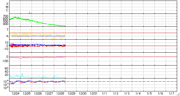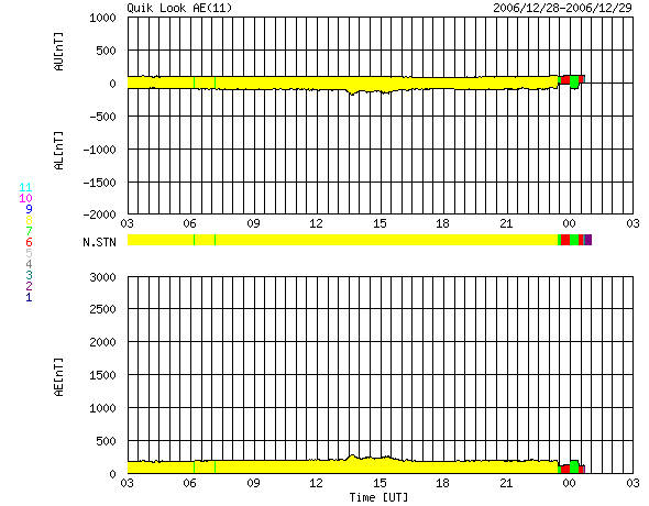 ACEが観測した太陽風の磁場(1番上の枠、白線は全体の強度、赤線は南北成分) および、太陽風の密度(3番目の橙線)、速度(4番目の黄線) (c) NOAA/SEC ![]() リアルタイムAE指数 下段のAEグラフの値が高くなると、オーロラ活動が活発化しています。 (c) 京都大学, NICT ![]() 27日の太陽周期に合わせたデータプロット 太陽が同じ面を地球に向けていた27日前の変化から、今後を予想することができます。 (c) NICT