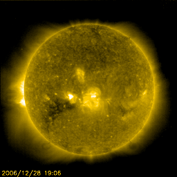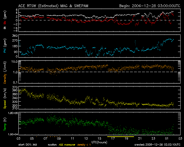 2006/12/29 11:04 更新 太陽風はとても低速です(320km/秒)。太陽は無黒点になっています。 担当 篠原 太陽風は更に速度を下げ、320km/秒とかなり低速になっています。 磁場強度も3nT前後と弱まった状態が続いています。 たいへん穏やかな太陽風です。 地球磁気圏への影響もかなり小さくなっていて、 オーロラの活動度を示すAE指数には、ほとんど変化が見られません。 このまま穏やかな状態が年末いっぱい続くと予想されます。 SOHO EIT284の太陽写真には、太陽の中心からやや南東(左下)に寄った領域に コロナホールが見えています。 このコロナホールが、明日くらいに太陽の中心線に達し、 地球方向に高速のプラズマの風(太陽風)を吹き出します。 高速の太陽風は、3日ほどかかって地球へ到達し、 磁気圏にエネルギーを与え、強いオーロラ活動を引き起こすのです。 次の高速風の到来は、1月2日頃になると思われます。 1日には、前兆となる磁場強度の強まりなどが始まるでしょう。 放射線帯の高エネルギー電子は、警戒レベルで安定したままです。 このまま、年明けの擾乱がくるまで、高いレベルを保ちそうな様子です。 太陽もとても穏やかです。 太陽写真には931、932黒点群の番号が書かれていますが、 実際には黒点は消えてしまっていて、太陽面は無黒点だそうです。 こちらも当面は、穏やかな状態が続くでしょう。 SOHO衛星のEIT284カメラの映像 (c) SOHO (ESA & NASA)