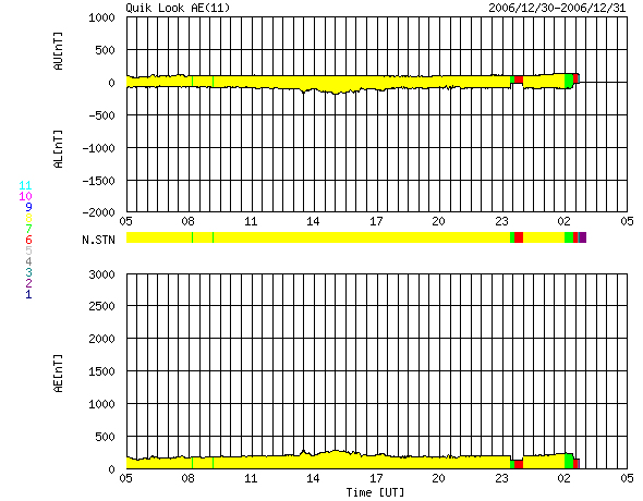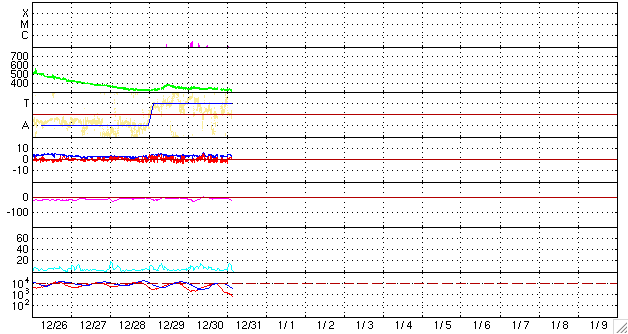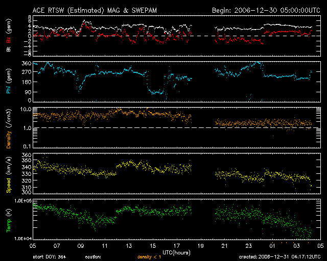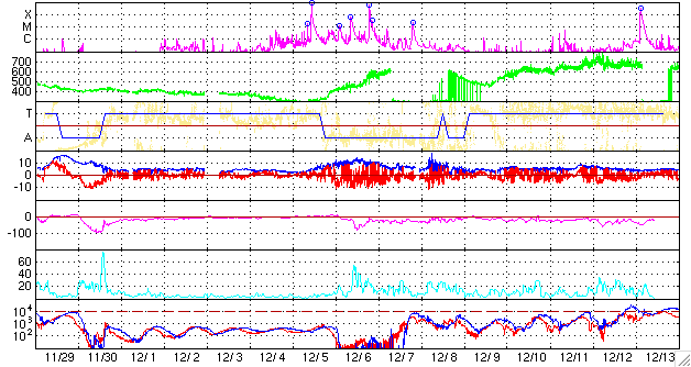 SOHO衛星のMDIカメラによる太陽黒点 (c) SOHO (ESA & NASA) ![]() GOES衛星の太陽X線データ (c) NOAA/SEC ![]() ACEが観測した太陽風の磁場(1番上の枠、白線は全体の強度、赤線は南北成分) および、太陽風の密度(3番目の橙線)、速度(4番目の黄線) (c) NOAA/SEC ![]() リアルタイムAE指数 下段のAEグラフの値が高くなると、オーロラ活動が活発化しています。 (c) 京都大学, NICT ![]() シベリアで観測された3日間の磁場データ 右側の3分の1が、昨日のデータになります。グラフが上がったり下がったりすると、オーロラ活動が活発化しています。 (c) NICT ![]() 27日の太陽周期に合わせたデータプロット 太陽が同じ面を地球に向けていた27日前の変化から、今後を予想することができます。 (c) NICT