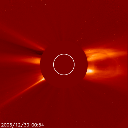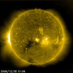 2006/12/31 13:20 更新 太陽風は低速で、磁気圏も穏やかです。太陽の東端から新しい黒点群が上がってきました。 担当 篠原 SOHO LASCO C2カメラで、CME(太陽ガスの放出現象)が、 太陽から西(右)に向かって飛び出しているのが観測されました。 30日7時(世界時29日22時)頃に開始しています。 このCMEは、フィラメント消失と関連した現象です。 SOHO EIT195の動画でその様子を見ることができます。 地球から見て、ほぼ横方向に飛び出していますので、 地球への影響はほとんど見られないでしょう。 太陽面の東端(左端)から、新しい黒点群が上がってきました。 今日掲載の写真にぎりぎりで見えています。 この黒点群には、933と番号が付けられています。 GOES衛星のX線データには目立った変化は無く、穏やかな黒点群のようです。 太陽はこのまま穏やかな状態が続きそうです。 太陽風は低速で安定しています。 昨日以降、330km/秒前後で推移しています。 太陽風磁場は強度3nT前後。 低速で磁場強度も弱まっているので、磁気圏の活動はかなり穏やかです。 オーロラ活動を示すAE指数には、ほとんど変化がありません。 シベリア磁場データを見ても、3日間を通してほとんど変化が見られません。 磁気圏が穏やかな状態が続いているのがよく分かります。 この穏やかな状態は、明日くらいまで続くと思われます。 その後、1月2日頃からコロナホールによる高速風がやってくるでしょう。 速度の上昇に先立って、太陽風の磁場に変化が現れると予想されます。 27日周期の図で12月5日を見ると、 速度(緑色線)の上昇よりも半日ほど早く、磁場強度(青線)が強まり始めています。 今回も、同様の変化が見られると思います。 明日の午後以降の太陽風磁場の変化に注目してください。 放射線帯の高エネルギー電子は、 ようやく警戒ラインを割る程度に減少しました。 引き続き減少して行くでしょう。 2006年は、今日で最後になりました。 今年も1年間ありがとうございました。 そろそろ太陽活動が次の周期に入る頃です。 来年の長期的な注目点は、太陽の次の極大への変化の始まりになるでしょう。 それでは、どうぞよいお年をお迎えください。 2007年も宇宙天気ニュースをよろしくお願いします。 SOHO衛星のEIT284カメラの映像 (c) SOHO (ESA & NASA)