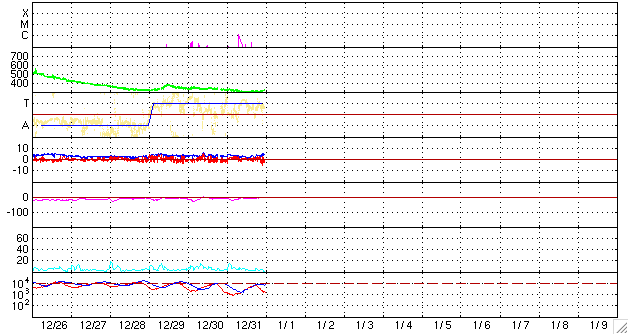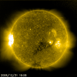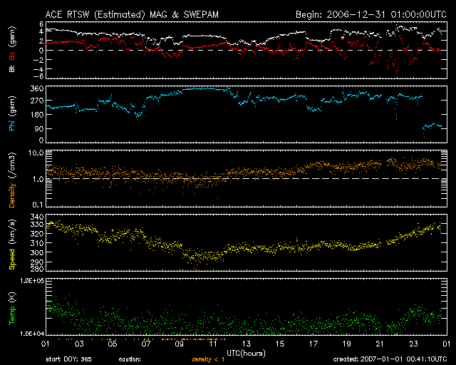 2007/ 1/ 1 09:43 更新 太陽風は低速で(320km/秒)、磁気圏は穏やかな状態です。C1の小規模フレアが発生しています。 担当 篠原 あけましておめでとうございます。 2007年も宇宙天気ニュースをよろしくお願いします。 昨日掲載したCMEが、SOHO LASCO C3でも観測されています。 連続写真でご覧下さい。 太陽の西(右)へ向かって、風船の様に丸く膨らんで飛び出しています。 横へ向かっていますので、地球への影響はないでしょう。 穏やかな太陽風が続いています。 速度は一旦300km/秒まで下がり、その後ゆっくりと320km/秒へやや上がっています。 磁場強度も一旦2nTへ下がり、4nTへ上がっている傾向が見られます。 密度もまた、1個/ccから4個/ccへの増加が見られます。 全体的に、太陽風に変化の兆しが見えているようです。 27日周期では、今日あたりから次の高速風への変化が見られると予想されています。 あるいは、その変化が早めに始まったのかもしれません。 まだ変化自体はとても小さいので、もうしばらく注目する必要があります。 この後も、磁場強度の強まりが継続するようだと、 高速風の到来は前周期よりも半日ほど早まることになりそうです。 太陽風は、速度としてはかなり低速です。 磁場強度も弱まっており、このため磁気圏活動もまた穏やかです。 AE指数には全く変化が観測されていません。 今後、磁場強度が強まった場合は、 それに従って大きな南向きが現れやすくなり、オーロラ活動を強める可能性があります。 そこに、速度上昇が加わると、極域の空は一気ににぎやかになるでしょう。 放射線帯の高エネルギー電子は、減少を続けています。 警戒レベルから次第に離れています。 次の高速風が最高速に達するくらいから、再び増加が始まると思われます。 太陽では、933黒点群がしっかりと姿を見せています。 昨日、31日16時(世界時31日7時)にC1の小さな小規模フレアを起こしました。 X線のグラフの様子では、933黒点群はそれほど活発ではないと思いますが、 どの程度の黒点群なのか、しばらく様子を見たいところです。 SOHO衛星のEIT284カメラの映像 (c) SOHO (ESA & NASA)