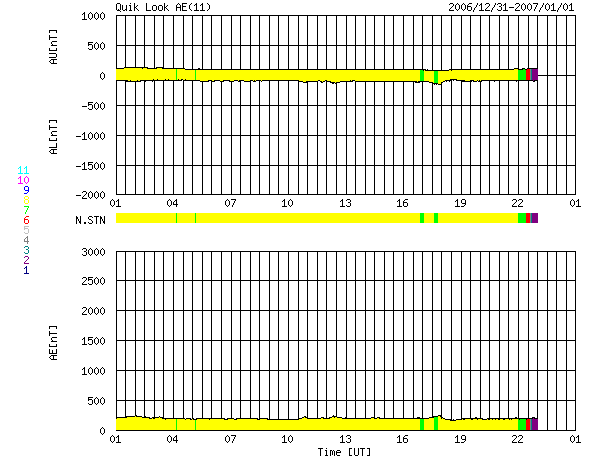 ACEが観測した太陽風の磁場(1番上の枠、白線は全体の強度、赤線は南北成分) および、太陽風の密度(3番目の橙線)、速度(4番目の黄線) (c) NOAA/SEC ![]() リアルタイムAE指数 下段のAEグラフの値が高くなると、オーロラ活動が活発化しています。 (c) 京都大学, NICT ![]() 27日の太陽周期に合わせたデータプロット 太陽が同じ面を地球に向けていた27日前の変化から、今後を予想することができます。 (c) NICT