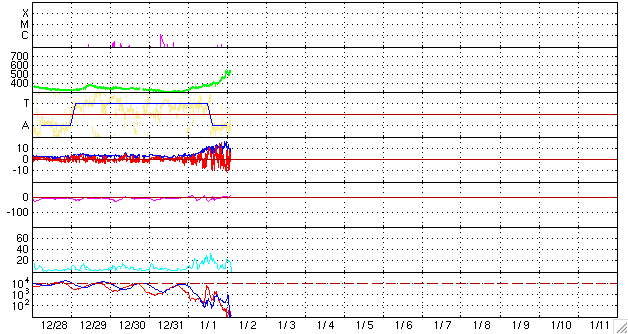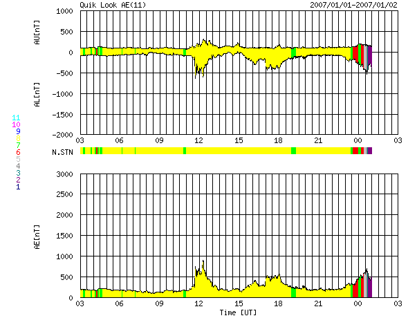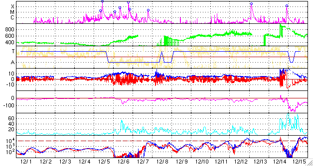 ACEが観測した太陽風の磁場(1番上の枠、白線は全体の強度、赤線は南北成分) および、太陽風の密度(3番目の橙線)、速度(4番目の黄線) (c) NOAA/SEC ![]() リアルタイムAE指数 下段のAEグラフの値が高くなると、オーロラ活動が活発化しています。 (c) 京都大学, NICT ![]() 27日の太陽周期に合わせたデータプロット 太陽が同じ面を地球に向けていた27日前の変化から、今後を予想することができます。 (c) NICT