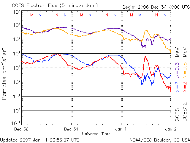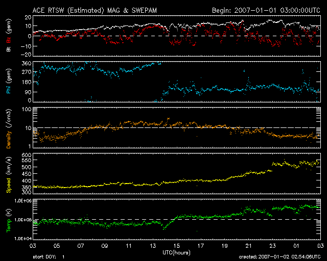 2007/ 1/ 2 11:55 更新 高速風の領域に入りました(530km/秒)。オーロラも活発になっています。 担当 篠原 太陽風が高速になっています。 昨日のニュース以降、太陽風の速度(ACEの黄色線)は上昇を続けています。 昨日の320km/秒から、現在は530km/秒まで上がっています。 昨日見られていた太陽風の変化は、高速風の始まりだったようです。 太陽風の磁場強度(白線)は、速度よりも一足早く、 1日22時(世界時1日13時)頃に10nTまで強まっています。 その後も、10nT前後で安定しています。 磁場の南北成分(赤線)も、磁場強度の強まりに従って、 大きめの振幅で南北に変化する様になっています。 南向きが強まり(赤線がマイナスに変化する)、速度が上昇することでオーロラ活動が強まっています。 AE指数を見ると、500〜800nTくらいの中規模の活動が見られています。 現在、速度が高まっているので、より活発なオーロラ活動が起こりやすくなっています。 27日周期で前回と比較すると、1日ほど高速風の到来が早まったようです。 前周期のこの高速風帯では、最高速は600km/秒に達しています(一部欠測になっています)。 このため、今回ももうしばらく上昇が続く可能性があります。 磁場強度が5nTくらいに下がるくらいまでは、注意が必要です。 高速風は明後日くらいまで続くと思われます。 活発なオーロラ活動が期待できるのは、主に今日から明日にかけてでしょう。 放射線帯の高エネルギー電子は、オーロラ活動の影響でかなり減少しています。 今後、高速風の後半くらいから上昇する可能性がありますので、 この後の変化にも注目して下さい。 太陽では、933黒点群に続いて、934黒点群の番号が付けられています。 黒点としては、昨日の写真でも既に見えていました。 X線のグラフでは、C1の小規模フレア以降は目立った変化は見られていません。 黒点群の活動度は低い様です。 太陽は、穏やかな状態が続くでしょう。 SOHO衛星のEIT284カメラの映像 (c) SOHO (ESA & NASA)