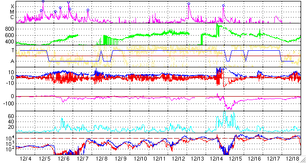 (c) NOAA/SEC ![]() SOHO衛星のMDIカメラによる太陽黒点 (c) SOHO (ESA & NASA) ![]() GOES衛星の太陽X線データ (c) NOAA/SEC ![]() | ||||||||||||||||||||||||||||||||||||||||||||||||||||||||||||