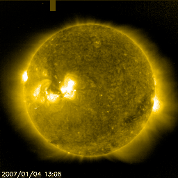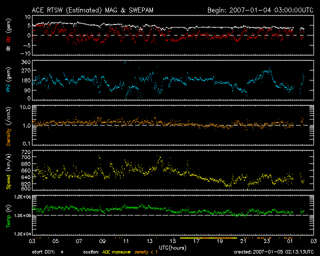 2007/ 1/ 5 11:14 更新 たいへん高速の太陽風が続いています(620km/秒)。これから速度の低下が始まると思います。 担当 篠原 太陽風は、600km/秒を超えるたいへん高い速度を保っています。 昨日のニュースの後も、日が変わる頃まで650km/秒のままでした。 そして、5日2時(世界時4日17時)くらいに、620km/秒へと少しだけ下がりましたが、 依然、高速風はかなりがんばっています。 一方、太陽風の磁場強度は、5nTから3nTへと弱まっています。 小さな変化に見えますが、3nTまで弱まると、 高速風もいよいよ終盤だなという気分になります。 磁場強度が本格的に弱まって来ましたので、 太陽風の速度は、これから次第に下がって行くでしょう。 今日のうちにでも600km/秒台を割って、 明日、明後日と次第に穏やかな太陽風へ戻って行くと思います。 その後の予想ですが、SOHO EIT284の太陽写真には、 コロナホールは見られないので、穏やかな状態がしばらく続くと思います。 実は、この期間は、10月までは安定してコロナホールによる高速風がやって来ていました。 ところが、コロナホールの場所に黒点群が発生して、11月には高速風が消えてしまったのです。 続いて、12月にはここで大規模なフレアが発生しました。 27日周期の図では、 12月10日以降はその大規模な爆発にともなう周期性のない高速風擾乱が観測されていて、 今周期の予想には使えません。 27日周期の図の完全版のページでは、前々周期の11月13日以降の変化を見ることができます。 長期間存在したコロナホールと、それを打ち消す黒点群の発生、大規模フレア活動。 今周期にこの領域がどの様な太陽風を作っているのか、注目しています。 高速風が続いているため、オーロラ活動も続いています。 ただし、磁場強度が弱まって来たので、活動度としては下がっています。 AE指数では、500nTから、それをやや下回る程度の弱めの活動が見られているだけです。 磁場強度は一段と弱まっていますし、今後は速度も低下を始めると思われますので、 それに従って、オーロラの規模は小さくなって行くでしょう。 放射線帯高エネルギー電子の増加が続いています。 まだ警戒レベル(10000の線)には達していませんが、 明日には、到達しそうです。 しかし、これから大きく増加することはないように思います。 太陽のフレア活動は穏やかです。 933, 934, 935の3つの黒点群が見えていますが、活動的ではありません。 穏やかな状態が続くでしょう。 SOHO衛星のEIT284カメラの映像 (c) SOHO (ESA & NASA)