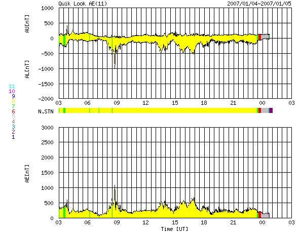 ACEが観測した太陽風の磁場(1番上の枠、白線は全体の強度、赤線は南北成分) および、太陽風の密度(3番目の橙線)、速度(4番目の黄線) (c) NOAA/SEC ![]() リアルタイムAE指数 下段のAEグラフの値が高くなると、オーロラ活動が活発化しています。 (c) 京都大学, NICT ![]() 27日の太陽周期に合わせたデータプロット 太陽が同じ面を地球に向けていた27日前の変化から、今後を予想することができます。 (c) NICT