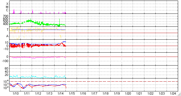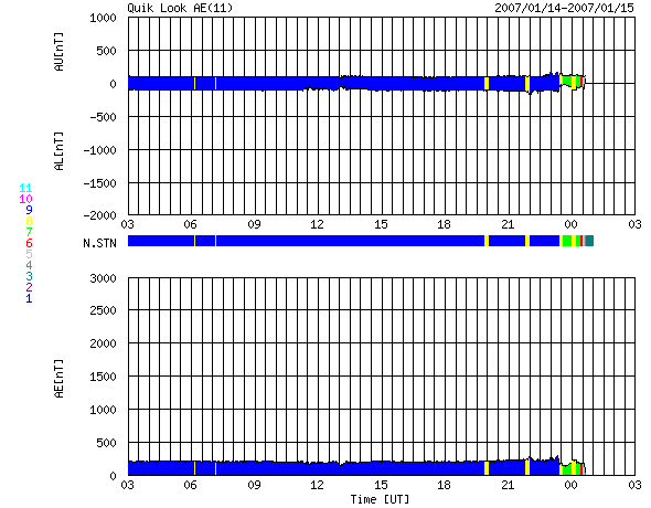 ACEが観測した太陽風の磁場(1番上の枠、白線は全体の強度、赤線は南北成分) および、太陽風の密度(3番目の橙線)、速度(4番目の黄線) (c) NOAA/SEC ![]() リアルタイムAE指数 下段のAEグラフの値が高くなると、オーロラ活動が活発化しています。 (c) 京都大学, NICT ![]() 27日の太陽周期に合わせたデータプロット 太陽が同じ面を地球に向けていた27日前の変化から、今後を予想することができます。 (c) NICT