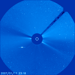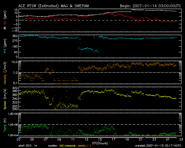 2007/ 1/15 11:18 更新 太陽風の磁場強度が強まっています。速度はやや遅めです。 担当 篠原 マックノート彗星は、太陽の横を通り過ぎ、 画面の外へ向かっています。 SOHOで見えるのも、今日から明日にかけてまでとなりそうです。 太陽風の密度が減少しているとお知らせしましたが、 14日21時(世界時14日12時)に、一気に回復しています。 ACEの図の橙色の線が、太陽風の密度を示しています。 1立方cmあたり0.2-0.3個から、2-4個へと一気に回復しました。 それに続くように、磁場強度がどんどん上昇しています。 15日5時(世界時14日20時)には、15nTに近づくほどに強まり、注目されます。 状況はよくわかりませんが、 太陽風の状況が大きく変化したという印象です。 この後に、コロナホールによる高速風が地球へやって来ますので、 それとも関係しているかもしれません。 ただし、現在は磁場強度は弱まる傾向にあります。 現在の太陽風速度は、350km/秒でやや低速の状態です。 速度も下がり気味で、まだ高速風が始まる雰囲気ではありません。 この後の太陽風の変化が注目されます。 磁場強度が強まると、大きな南向きが現れやすくなります。 すると、地球の磁気圏に大きなエネルギーが流れ込み、 オーロラが活動的になります。 磁場強度が強まっている間は、この点にも注意が必要です。 これから明日くらいにかけて、高速の太陽風がやって来ると予想されます。 前周期の高速風は、最高速が700km/秒まで上がり、 高速状態が1週間にわたって続くという、かなり規模の大きなものでした。 今周期はどのように推移するでしょうか。 太陽では、X線のグラフにBクラスの小さな変動が続いています。 新しく出現した938黒点群が起こしているそうです。 ただ、黒点群の規模は小さいですので、 大きな活動になることはないでしょう。 SOHO LASCO C3による、マックノート彗星の動画。 (c) ESA & NASA ![]() SOHO衛星のEIT284カメラの映像 (c) SOHO (ESA & NASA)