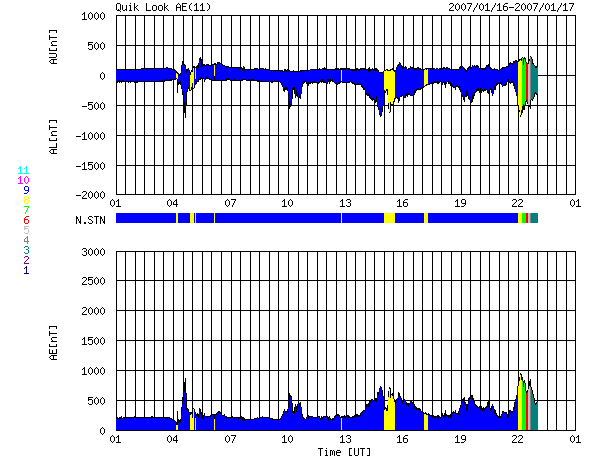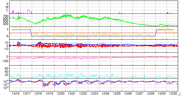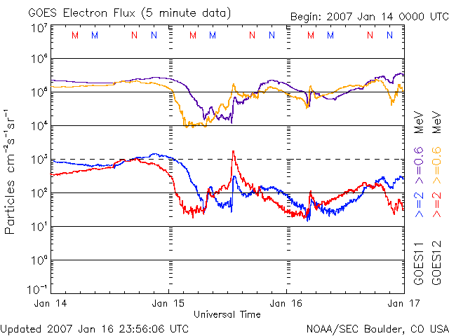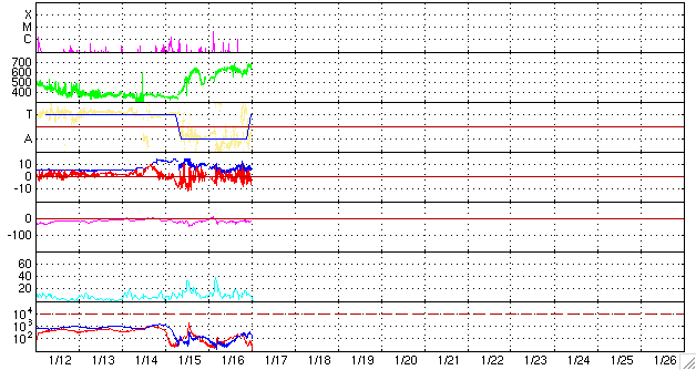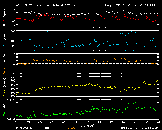 2007/ 1/17 09:53 更新 高速太陽風が続いています(650km/秒)。小規模フレアが発生しています。 担当 篠原 マックノート彗星が、SOHO衛星LASCO C3カメラを通過して行きました。 最後の動画を掲載します。 かなり容量が大きくなっていますので(5MB)、 回線が細い方には申し訳ありません。 接近していた頃には、青空の中でも観測できたそうです。 さて、太陽風は昨日よりももう一段速くなって、650km/秒に達しています。 かなり高速の状態です。 昨日以降の変化としては、 16日14時(世界時16日5時)頃に再び600km/秒を超え、 以後600km/秒台を保っています。 磁場強度は5nTから10nTの間で変動しています。 下がりきってはいませんが、強まっているという印象でもありませんので、 太陽風の速度は、ほぼ最高速に達しているのではないかと思います。 SOHO EIT284の太陽写真を見ると、 南半球(下半分)に横に長く広がったコロナホールが、 西半球側(右側)へと通過しつつあります。 最後尾が太陽の中央線を通過したくらいです。 このため、もう3日は太陽風が高速の状態になりそうです。 一方、27日周期の図の前周期を参考にすると、 もう一息長く、まだ5日くらい続きそうです。 高速風の後半は長めになりますから、 前周期程度に引きずるのではないでしょうか。 1月20〜21日くらいまでと予想されます。 AE指数によると、オーロラ活動は、 500〜700nTの中規模の変動が度々発生しています。 速度はかなり高くなっていますが、活動としては激しいものではありません。 太陽風磁場の南向き成分が、 小刻みに-5nT弱に変化している程度しか見られていないためでしょう。 今後も高速風は続きますので、現状程度の中規模活動が続くと思います。 放射線帯の高エネルギー電子は、レベルが下がったままです。 引き続き変化に注目する必要があります。 太陽では、16日11時半(世界時16日2時半)に、 938黒点群でC4.2の小規模フレアが発生しました。 また、17日1時(世界時16日16時)にも、C1.1の小規模フレアが発生しています。 太陽写真では、相変わらずほとんど見えない様な規模の黒点なのですが、 なかなかがんばっている様です。 この黒点群は引き続き、小規模フレアを発生させるかもしれません。 しかし、いきなり大きな活動になることはないと思います。 SOHO LASCO C3の画面を、マックノート彗星が通過していきました。 (c) ESA & NASA ![]() ACEが観測した太陽風の磁場(1番上の枠、白線は全体の強度、赤線は南北成分) および、太陽風の密度(3番目の橙線)、速度(4番目の黄線) (c) NOAA/SEC ![]() リアルタイムAE指数 下段のAEグラフの値が高くなると、オーロラ活動が活発化しています。 (c) 京都大学, NICT ![]() 27日の太陽周期に合わせたデータプロット 太陽が同じ面を地球に向けていた27日前の変化から、今後を予想することができます。 (c) NICT