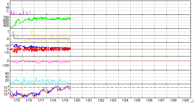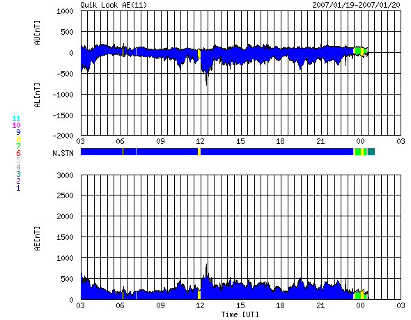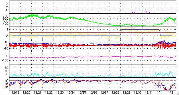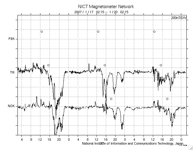 ACEが観測した太陽風の磁場(1番上の枠、白線は全体の強度、赤線は南北成分) および、太陽風の密度(3番目の橙線)、速度(4番目の黄線) (c) NOAA/SEC ![]() リアルタイムAE指数 下段のAEグラフの値が高くなると、オーロラ活動が活発化しています。 (c) 京都大学, NICT ![]() シベリアで観測された3日間の磁場データ 右側の3分の1が、昨日のデータになります。グラフが上がったり下がったりすると、オーロラ活動が活発化しています。 (c) NICT ![]() 27日の太陽周期に合わせたデータプロット 太陽が同じ面を地球に向けていた27日前の変化から、今後を予想することができます。 (c) NICT