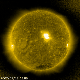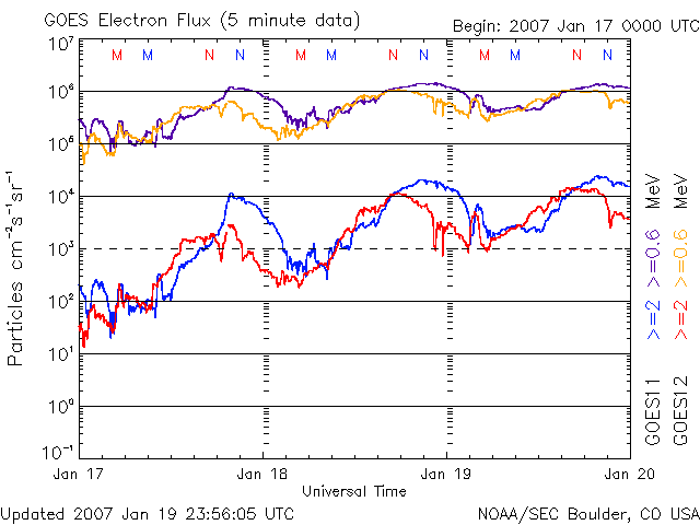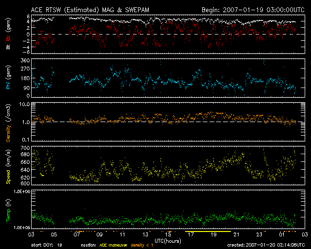 2007/ 1/20 11:15 更新 600km/秒台の高速の太陽風が続いています。放射線帯の高エネルギー電子が高いレベルです。 担当 篠原 600km/秒台の、かなり高速の太陽風が続いています。 昨日から今日にかけてのACEデータ(黄色線)の変化を見ると、 600km/秒と700km/秒のかなり高速の領域を、上がったり、下がったりしています。 一方、磁場強度(白線)はゆっくりと下がり始めています。 5nTから4nTへ、明らかに弱まりの傾向にあります。 磁場強度は、この後も次第に低下していくでしょう。 磁場強度が下がってきたことから、高速風帯も後半に入ったと考えられます。 この後は、速度も次第に下がって行くことになるでしょう。 27日周期の図も参考に考えると、明日にかけて600km/秒台が続き、 それから本格的な低下が始まりそうです。 SOHO EIT284の太陽写真を見ると、 西側(右側)に移動して行ったコロナホールは、かなり見にくくなっています。 やがて、地球はその影響域から脱することになります。 太陽風が通常の速度レベルにもどるのは、23日頃になりそうです。 オーロラ活動への影響度を決定する、太陽風磁場の南北成分(ACEの赤線)は、 南北(マイナス=南、プラス=北)に細かく振動する変化に変わっています。 昨日のゆったりとした変化と雰囲気がだいぶ変わったことを、 図を参照して比べてみてください。 時間的にまとまった南向きでない分、 地球の磁気圏へのエネルギーの流れ込みが減少した様です。 オーロラの活動度はずいぶん弱まっています。 AE指数では、時々500nTに達する中規模の変動が見られているだけで、 その他は300nTくらいの小規模の変化に弱まっています。 シベリアの3日間の磁場変化の図を見ると、 活動度が弱まっているのがよくわかります。 この図では、オーロラが発生すると、オーロラ電流のためにグラフが下へ下がります。 下へ下がるほど、激しい活動が発生していたことを示しています。 3日間の変化の幅が、次第に小さくなっているのがお分かりでしょうか。 この後も磁場強度は弱まり、やがて速度も下がり始めます。 どちらも、オーロラ活動を弱める要因です。 一時的に活発な変化が見られることはありますが、 全体的には、次第に穏やかになっていきます。 放射線帯の高エネルギー電子は、警戒状態が続いています。 大きな増加は止まりましたが、赤線のGOES12が、 しっかりと警戒レベルを超える様になりました。 この状態はこれから数日間(前周期を参考にすると約1週間) にわたって続くと予想されます。 太陽のフレア活動はたいへん穏やかです。 938黒点群はとても小さくなっていて、やっと見える程度です。 SOHO LASCO C3では、淡いCME(太陽ガスの放出現象)が見られていますが、 太陽面で対応する現象は見られず、裏側の現象だと思われます。 SOHO衛星のEIT284カメラの映像 (c) SOHO (ESA & NASA)