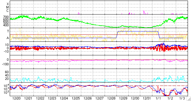 (c) NOAA/SEC ![]() SOHO衛星のMDIカメラによる太陽黒点 (c) SOHO (ESA & NASA) ![]() GOES衛星の太陽X線データ (c) NOAA/SEC ![]() | ||||||||||||||||||||||||||||||||||||||||||||||||||||||||||||