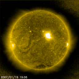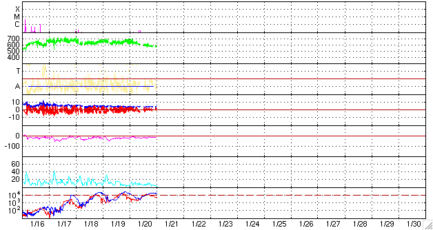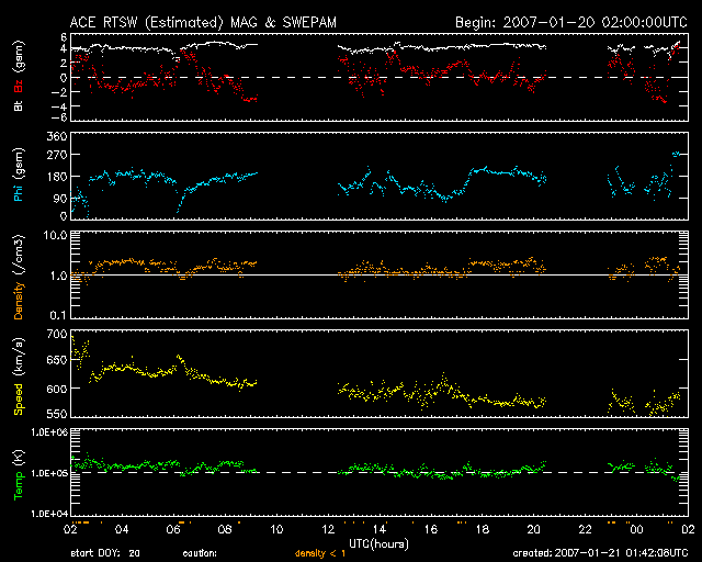 2007/ 1/21 10:43 更新 太陽風の速度が下がり始めました(550km/秒)。新しい黒点群が発生しています。 担当 篠原 太陽風の速度(ACEの黄色線)が低下を始めました。 昨日の600〜700km/秒から、現在は、550km/秒に下がっています。 依然高速ですが、この後も速度は次第に低下して行くでしょう。 一方、磁場強度(白線)はほとんど変わらず、4nTのレベルを維持しています。 南北成分(赤線)は細かい振動がなくなり、0nTを中心として、 ちらちらと南北に揺れるような変化です。 大きな南向き磁場は見られず、オーロラ活動も落ち着きつつあります。 AE指数では、500nTの中規模活動がひとつ見られていますが、 その他の時間帯では、小さな変化に留まっています。 今後も速度は下がり続け、 そのためオーロラ活動も穏やかになって行くでしょう。 明後日、23日頃には、通常レベルの速度に戻っていると予想されます。 SOHO EIT284の太陽写真は、1日前の写真です。 全体的にのっぺりしていて、大きなコロナホールは見えていません。 このことから、高速風の通過後は、しばらく穏やかな状態が続きそうです。 27日周期の図によると、28-29日頃から次の高速風が始まりそうなのですが、 その原因となるコロナホールは、まだ太陽のこちら側に来ていません。 放射線帯の高エネルギー電子は、警戒レベルを保っています。 衛星の運用では注意が必要な状態が続いています。 今後の高エネルギー電子の減少はゆっくりと進みます。 しばらく現状のレベルが続くでしょう。 太陽のフレア活動は穏やかです。 新しく939黒点群が発生したそうです。 太陽写真で中心付近に黒点の姿が見えていますが、これがその黒点群です。 そして、X線のグラフが低いレベルでざわついています。 新しい黒点群の発生によるものだと思われます。 更に活動度を強めるかどうか、今後の変化に注目する必要があります。 SOHO衛星のEIT284カメラの映像 (c) SOHO (ESA & NASA)