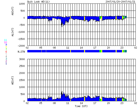 ACEが観測した太陽風の磁場(1番上の枠、白線は全体の強度、赤線は南北成分) および、太陽風の密度(3番目の橙線)、速度(4番目の黄線) (c) NOAA/SEC ![]() リアルタイムAE指数 下段のAEグラフの値が高くなると、オーロラ活動が活発化しています。 (c) 京都大学, NICT ![]() 27日の太陽周期に合わせたデータプロット 太陽が同じ面を地球に向けていた27日前の変化から、今後を予想することができます。 (c) NICT