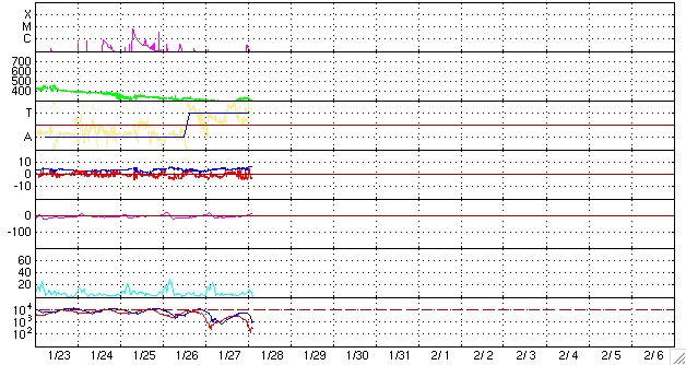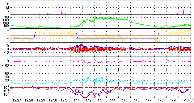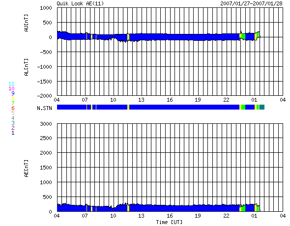 ACEが観測した太陽風の磁場(1番上の枠、白線は全体の強度、赤線は南北成分) および、太陽風の密度(3番目の橙線)、速度(4番目の黄線) (c) NOAA/SEC ![]() リアルタイムAE指数 下段のAEグラフの値が高くなると、オーロラ活動が活発化しています。 (c) 京都大学, NICT ![]() 27日の太陽周期に合わせたデータプロット 太陽が同じ面を地球に向けていた27日前の変化から、今後を予想することができます。 (c) NICT