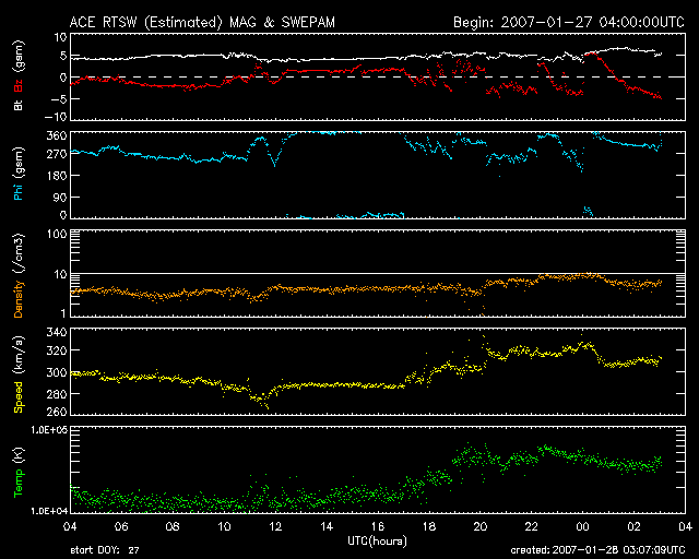2007/ 1/28 12:08 更新 太陽風速度は遅く(300km/秒)、磁気圏は穏やかです。高速風の始まりに注目してください。 担当 篠原 宇宙天気は穏やかな状態が続いています。 しかし、これからコロナホールによる高速の太陽風がやって来ると予想されます。 (昨日と同じ写真ですが、SOHO EIT284の中心にコロナホールが見えています) ACEのデータでは、変化が始まっている様にも見えます。 今後の変化に注目して下さい。 昨日より、太陽風は速度300km/秒前後のかなり低速の状態が続いています。 速度が下がりきっているため、磁気圏への影響は小さく、 オーロラ活動はたいへん穏やかです。 AE指数のグラフにはほとんど変化が見えません。 一方、ACEの磁場強度を見ると、昨日までは4nTに弱まっていたのが、 昨日のニュース直後に5nTへ上がり、図の最後の部分で6nTに強まっています。 まだ変化としては小幅なのですが、 これから高速太陽風がやってくることは間違いありませんので、 その変化の兆しが見えているのかもしれません。 いずれにせよ、今日のうちには磁場強度は本格的に強まり始めると思われます。 10nTくらいまで強まるでしょう。 磁場の変化を追いかける様に、速度にも変化が始まります。 磁場がしっかりと強まった頃から本格的に上昇が始まり、 今日から明日にかけて上がり続けることになるでしょう。 前周期のデータを参考にすると、最高速は700km/秒くらいまで上がりそうです。 磁場強度が強まると、大きく南を向く可能性が出てきます。 その影響で磁気圏が乱れやすくなり、 オーロラ活動が強まったり、磁気嵐が発生したりします。 速度が上がり始めた頃から、速度が最高速に達して磁場強度が下がるくらいまでが 最も活動的になる期間です。 太陽では940黒点群がB3の小さなフレアを起こしています。 しかし、昨日以降のグラフを見ていると、940黒点群の活動度は下がっている様です。 太陽のフレア活動は穏やかに推移しそうです。 放射線帯の高エネルギー電子は、密度が下がり、 警戒レベルを切りました。 今後、高速風の中盤くらいから再び増加する可能性があります。 SOHO衛星のEIT284カメラの映像 (c) SOHO (ESA & NASA)