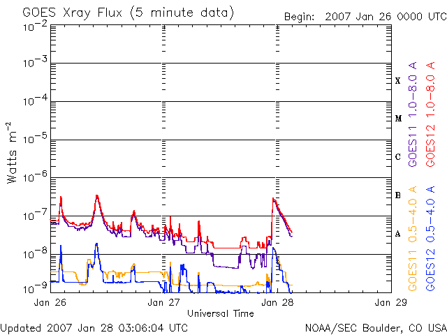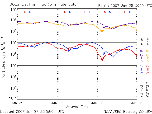 (c) SOHO (ESA & NASA) ![]() GOES衛星の太陽X線データ (c) NOAA/SEC ![]() GOES衛星による、静止衛星軌道における高エネルギー電子の変化 (c) NOAA/SEC ![]() | ||||||||||||||||||||||||||||||||||||||||||||||||||||||||||||