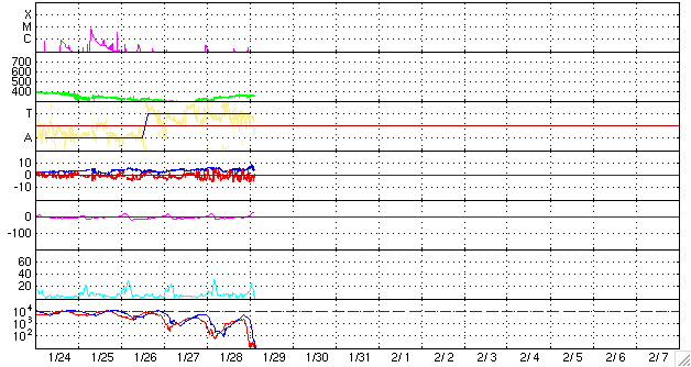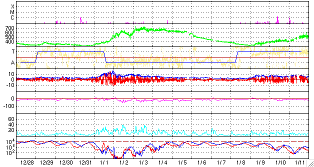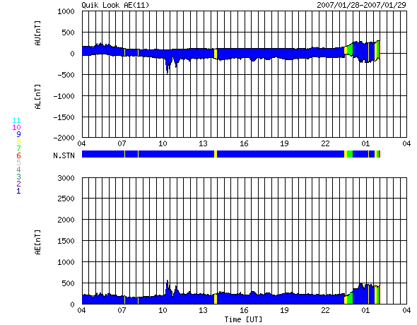ACEが観測した太陽風の磁場(1番上の枠、白線は全体の強度、赤線は南北成分) および、太陽風の密度(3番目の橙線)、速度(4番目の黄線) (c) NOAA/SEC ![]() リアルタイムAE指数 下段のAEグラフの値が高くなると、オーロラ活動が活発化しています。 (c) 京都大学, NICT ![]() 27日の太陽周期に合わせたデータプロット 太陽が同じ面を地球に向けていた27日前の変化から、今後を予想することができます。 (c) NICT