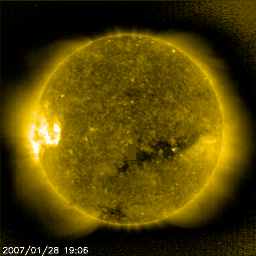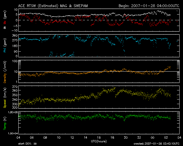 2007/ 1/29 12:43 更新 太陽風の速度はやや遅く(350km/秒)、高速風はまだ来ていません。 担当 篠原 太陽風の変化はまだ始まっていません。 昨日のニュースでは、変化が始まるのかもしれないと書きましたが、 現時点まで目立った変化は起きていません。 27日周期の図で見ると、変化の到来が1日分は遅れています。 コロナホールの様子から、むしろ早まるかもしれないと予想していたのですが、 遅れる方向にずれてしまいました。 SOHO EIT284の写真を見ると、 コロナホールは、地球へ影響が及び始める目安の位置、 右側の半分にまで達しています。 この後、速度の上昇がいつ始まってもおかしくない状態です。 ACEのグラフでは、密度が最新のところで高まっています。 今後の太陽風の変化に注目してください。 現在は、太陽風の速度は350km/秒。磁場強度は5nTです。 やや遅めという状態です。 磁場の南北成分が、-5nTくらいに変化しています。 AE指数のグラフは、それほど変化をしてませんが、 ある程度のオーロラ活動は見えているいるのではないかと思います。 今後、高速風が始まると、一気に活動的に変わるでしょう。 太陽では、940黒点群がBクラスの小さな変動を起こしています。 黒点の数が少し増えているそうですが(掲載の太陽写真は昨日と同じです)、 今のところは穏やかに推移しそうです。 SOHO衛星のEIT284カメラの映像 (c) SOHO (ESA & NASA)