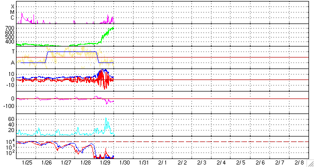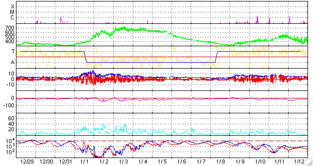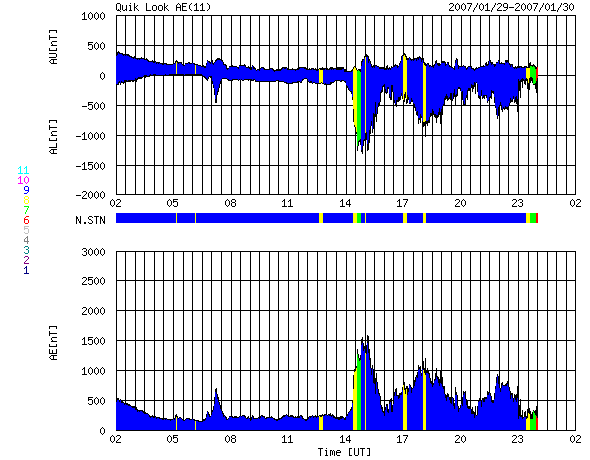 ACEが観測した太陽風の磁場(1番上の枠、白線は全体の強度、赤線は南北成分) および、太陽風の密度(3番目の橙線)、速度(4番目の黄線) (c) NOAA/SEC ![]() リアルタイムAE指数 下段のAEグラフの値が高くなると、オーロラ活動が活発化しています。 (c) 京都大学, NICT ![]() 27日の太陽周期に合わせたデータプロット 太陽が同じ面を地球に向けていた27日前の変化から、今後を予想することができます。 (c) NICT