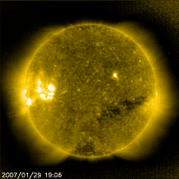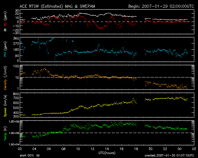 2007/ 1/30 10:08 更新 太陽風の速度が大きく上昇しています(700km/秒)。激しいオーロラ活動が発生しました。 担当 篠原 昨日の夕方から太陽風の速度が上昇を始め、 一気に700km/秒まで上がっています。 27日周期の図で速度(緑色)の変化を見てください。 前周期の1月1-2日の変化と比較すると、 今回はとても急傾斜で速度が上がっています。 変化が1日遅れた分を、取り戻そうとしているかの様です。 昨日のニュースの直後、29日12時(世界時29日3時)頃から、 太陽風の磁場(ACEの白線)に変化が始まりました。 5nTから、7時間ほどかけて20nTまで強まっています。 かなりの振幅です。 それとともに、速度にも変化が始まり、 それまでの400km/秒から、 今朝、30日6時(世界時30日21時)頃に700km/秒へ達しました。 コロナホールの高速風としては、かなり高速の状態です。 その一方、速度が上がるとともに磁場強度は下がって行き、 現在は5nTへ弱まっています。 このことから、地球は高速風帯の最高速部分に達したと思われます。 また、昨日のニュースで密度(橙色線)が上がっていると書きましたが、 この変化も、高速風と関連した現象だった様です。 ACEの図を見ると、速度の上昇の前に密度の山ができ、 速度が上がるとともに密度は下がっています。 磁場強度の上昇と、速度の上昇が連続的に発生し、 磁気圏の活動がかなり活発になりました。 オーロラの活動を示すAE指数を見ると、 1500nTにも達する激しい変化がいきなり発生し、 その後も、1000nT規模の大きな変化が続いています。 ACEのデータを見ると、図の中ほどで、 磁場の南北成分が大きく-15nTも南を向いています。 この頃、速度は既に550km/秒に上がっていました。 この結果、1500nTの激しいオーロラが発生したのだと思われます。 極域の空では、壮大なオーロラを見ることができたのではないでしょうか。 その後、磁場強度が下がり、大きな南向きは見られなくなっています。 その一方、速度は700km/秒とかなり高くなりました。 この両者の兼ね合いでオーロラ活動の大きさが決まります。 速度がかなり高いので、中規模の変動がしばらく続くのではないでしょうか。 太陽では、30日1時半(世界時29日16時半)に、 C3.4の小規模フレアが発生しています。 その後にも、もうひとつC1のフレアが見られます。 発生箇所は940黒点群の様です。 黒点写真が更新されていませんので、SOHO EIT284の写真を見てください。 太陽の東側(左側)に、明るい領域が2つ見えていますが、 右側が940黒点群です。 左の明るい領域は、941黒点群と番号が付けられたそうです。 Cクラスを起こす様になり、940群は活動度が増しているようです。 今後も、小中規模のフレア活動を起こすかもしれません。 放射線帯の高エネルギー電子は、磁気圏活動の影響で大きく減少しています。 今後は、高速風の影響で、増加を始めると思われます。 明日、明後日にかけての変化に注目して下さい。 SOHO衛星のEIT284カメラの映像 (c) SOHO (ESA & NASA)