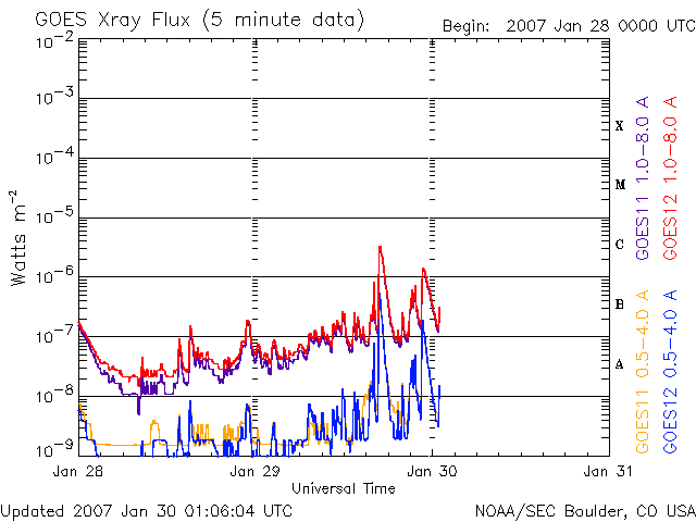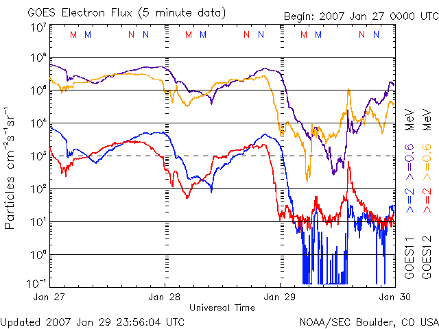 右側の3分の1が、昨日のデータになります。グラフが上がったり下がったりすると、オーロラ活動が活発化しています。 (c) NICT ![]() GOES衛星の太陽X線データ (c) NOAA/SEC ![]() GOES衛星による、静止衛星軌道における高エネルギー電子の変化 (c) NOAA/SEC ![]() | ||||||||||||||||||||||||||||||||||||||||||||||||||||||||||||