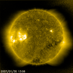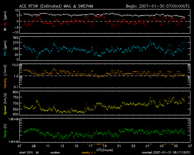 2007/ 1/31 15:18 更新 高速の太陽風が続いています(700km/秒)。オーロラ活動も活発です。 担当 篠原 太陽風の速度は、たいへん高い状態を保っています。 昨日のニュース以降、太陽風の速度は一旦650km/秒に下がりましたが、 日付が今日に変わった頃から再び上がり、現在は700km/秒を回復しています。 太陽風の磁場強度は5nTと通常レベルです。 高速風の後半によく見られる、磁場の弱まりはまだ見られません。 ACEの図の最後の部分で、3nTに下がっていますが、 これが続くかどうかはしばらく見る必要があります。 磁場強度が目立った低下を起こしていないとすると、 もうしばらく、現在の様なたいへん高い速度が続くと思われます。 27日周期の図で前周期の変化を見ると、600km/秒台は3日半くらい続いていました。 これを当てはめると、今回も、明後日にかけて600km/秒台が続くかもしれません。 今後、磁場強度が3nTレベルに下がると、速度低下が近いと考えてよいでしょう。 速度が大変高いため、中規模のオーロラ活動が続いています。 AE指数で500nTの変化が連続的に発生しています。 極域ではにぎやかなオーロラが見られたことでしょう。 引き続き、現在の速度レベルと、磁場強度が続けば、 オーロラ活動も同程度の規模が期待できます。 しかし、高速風の後半に入ると、磁場強度が弱まって南向きが小さくなり、 速度も下がり始めることで、オーロラも次第に穏やかになって行きます。 明日から明後日くらいまでは、 ある程度の活動が期待できるのではないでしょうか。 高速風の影響で、放射線帯の高エネルギー電子の数が一気に増大しています。 青線のGOES11が警戒レベルに達し、明日には、赤線のGOES12も届くかもしれません。 今後、衛星の運用では注意が必要です。 太陽のフレア活動は落ち着いています。 Cクラスの小規模フレア2回のあと、特に目立った変化は無く1日ほど経過しています。 X線強度自体が下がっていることから、 黒点群の活動も弱まっているのかもしれません。 いずれにせよ、現状ではフレア活動は穏やかに推移すると思われます。 本日は更新時刻が遅くなり、申し訳ありませんでした。 SOHO衛星のEIT284カメラの映像 (c) SOHO (ESA & NASA)