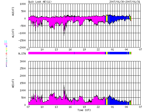 ACEが観測した太陽風の磁場(1番上の枠、白線は全体の強度、赤線は南北成分) および、太陽風の密度(3番目の橙線)、速度(4番目の黄線) (c) NOAA/SEC ![]() リアルタイムAE指数 下段のAEグラフの値が高くなると、オーロラ活動が活発化しています。 (c) 京都大学, NICT ![]() 27日の太陽周期に合わせたデータプロット 太陽が同じ面を地球に向けていた27日前の変化から、今後を予想することができます。 (c) NICT