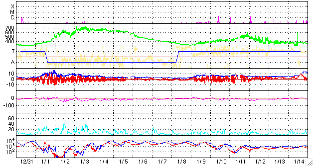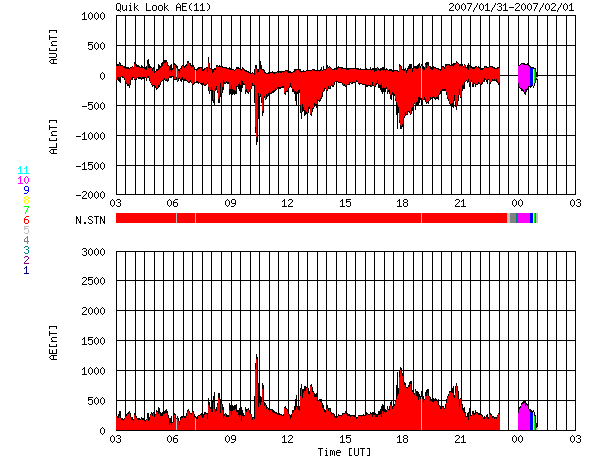 ACEが観測した太陽風の磁場(1番上の枠、白線は全体の強度、赤線は南北成分) および、太陽風の密度(3番目の橙線)、速度(4番目の黄線) (c) NOAA/SEC ![]() リアルタイムAE指数 下段のAEグラフの値が高くなると、オーロラ活動が活発化しています。 (c) 京都大学, NICT ![]() 27日の太陽周期に合わせたデータプロット 太陽が同じ面を地球に向けていた27日前の変化から、今後を予想することができます。 (c) NICT