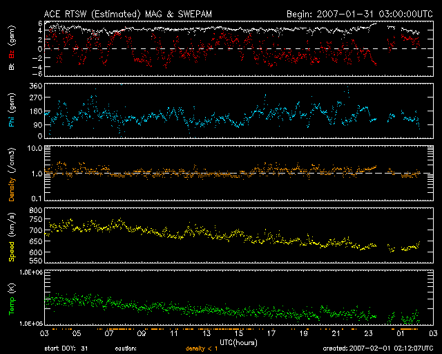2007/ 2/ 1 11:13 更新 やや下がりましたが、高速風が続いています(600km/秒)。オーロラも活発です。 担当 篠原 高速の太陽風が続いています。 昨日の700km/秒からは下がりましたが、 太陽風は現在も600km/秒の高い速度を保っています。 磁場強度は4nT。やや弱まっています。 しかし、まだ弱まり方が少ない印象です。 ですので、今日いっぱいくらいは、 太陽風はこのまま600km/秒台を保つのではないかと思います。 27日周期の図も参考に見てください。 前周期の速度の変化(緑色)を今周期に当てはめると、 今日までは高速が続いて、本格的な速度の低下は明日からになりそうです。 太陽風の磁場強度がもう少し弱まると、 いよいよ高速風帯も終わりだなという雰囲気になります。 オーロラ活動は活発に発生しています。 AE指数のグラフでは、700〜1000nT規模の活発な変動が断続的に発生しています。 太陽風磁場の南北成分を見ると、-2〜-4nTくらいの南向きの振動が連続的に見られています。 磁場の大きさとしては、小幅なのですが、速度が600km/秒超とかなり高めだったので、 オーロラ活動の規模も十分大きくなったのだと思われます。 高速風が続く間は、南向き磁場に対応して、活発なオーロラ活動が続くでしょう。 今日のAE指数のグラフは、ほとんどが赤色になっています。 このグラフの色は、AE指数の値を決めるために使用された観測点の数を示しています。 (図の左側余白に対応表が記してあります) AE指数は北極域の12個の観測点のデータから決められます。 ただ、ここで紹介しているAE指数は、最新情報ですので、 全ての観測点のデータが整っている訳ではありません。 このため、収集できた観測点の数をグラフの色で表現しているのです。 観測点の数が多いほど、信頼度は高くなります。 赤色は6観測点を意味していますが、普段よりも数が少なく、信頼度が落ちていることになります。 従って、観測点が揃ったときには、このグラフの変化はより激しくなっている可能性があります。 AE指数は各データの重ね合わせで決められますので、 観測点が増えることでグラフの変化が小さくなることはありません。 (この点は、平均処理とは異なります) 放射線帯高エネルギー電子は、更に増加しています。 ほぼ、両方の衛星が警戒ラインに達しています。 高速風は続いていますので、引き続き増加を続ける可能性があります。 衛星の運用では注意が必要な状況です。 SOHOの太陽黒点の写真が更新されず、今日も掲載していません。 SOHO EIT284の明るい領域で黒点群の位置を考えてください。 右側の明るい領域は940黒点群、左側は941黒点群です。 940黒点群がBクラスの弱いフレアを起こしていますが、全体的に活動度は低調です。 太陽のフレア活動は穏やかに推移するでしょう。 SOHO衛星のEIT284カメラの映像 (c) SOHO (ESA & NASA)