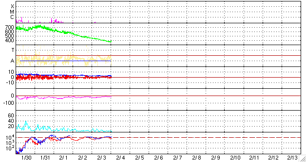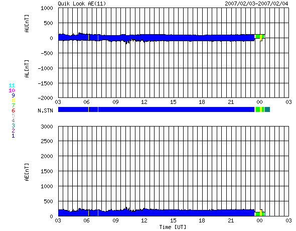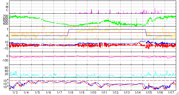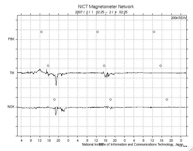 ACEが観測した太陽風の磁場(1番上の枠、白線は全体の強度、赤線は南北成分) および、太陽風の密度(3番目の橙線)、速度(4番目の黄線) (c) NOAA/SEC ![]() リアルタイムAE指数 下段のAEグラフの値が高くなると、オーロラ活動が活発化しています。 (c) 京都大学, NICT ![]() シベリアで観測された3日間の磁場データ 右側の3分の1が、昨日のデータになります。グラフが上がったり下がったりすると、オーロラ活動が活発化しています。 (c) NICT ![]() 27日の太陽周期に合わせたデータプロット 太陽が同じ面を地球に向けていた27日前の変化から、今後を予想することができます。 (c) NICT