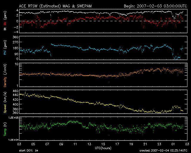2007/ 2/ 4 11:26 更新 太陽風は低速風になりつつあります(380km/秒)。オーロラ活動はとても穏やかです。 担当 篠原 太陽風は、速度(ACEの図の黄色線)が380km/秒へ下がっています。 高速風帯を抜け出した地球は、次第に低速風領域へと入っています。 27日周期の図を見て下さい。 前周期の変化をなぞる様に速度のグラフ(緑色)が変化しています。 速度は引き続き明日にかけて下がり続け、300km/秒近くまで下がりそうです。 前周期では、その後(1月10日頃)に400km/秒へと戻していますが、 今周期がどのような変化になるか、2月6日以降の太陽風が注目されます。 速度が下がるとともに、磁場強度(ACEの白線)も3nTと弱まっています。 グラフでは、南北成分(赤線)がゆっくりと南(-)と北(+)に変化している様に見えますが、 拡大されているだけで、変化そのものは+1〜-1nTくらいのとても小さなものです。 このため、磁気圏のオーロラ活動はとても静かです。 AE指数のグラフには全く変化が見られません。 また、シベリアの3日変化を見ると、 日ごとに変化が小さくなっているのがよく分かります。 右端3分の1の昨日分は、グラフが直線になっていて、全く変化が起きていません。 この後も、速度に乱れが発生しなければ、 現在の様な穏やかな状態が続くでしょう。 放射線帯の高エネルギー電子は、高いレベルを保っています。 昨日よりほとんど変化が見られません。 太陽のフレア活動も穏やかです。 黒点群は940、941の二つが見られますが、規模に目立った変化はありません。 SOHO衛星のEIT284カメラの映像 (c) SOHO (ESA & NASA)