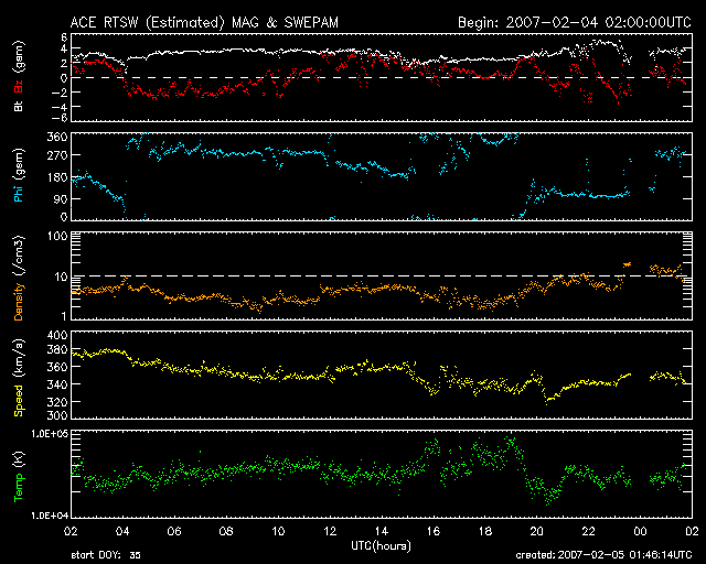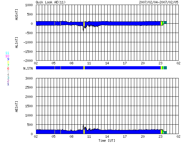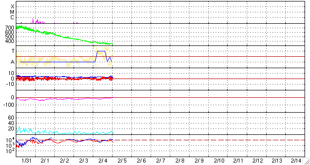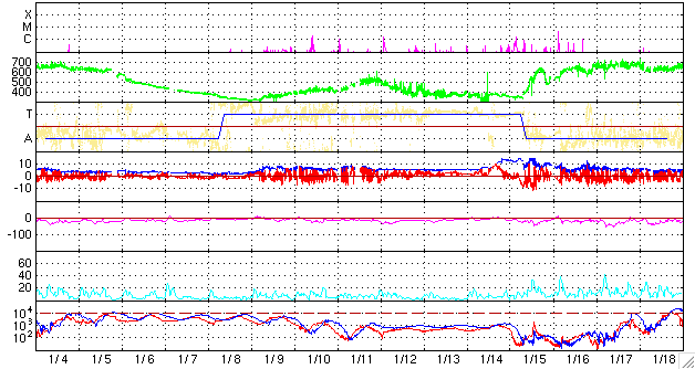 ACEが観測した太陽風の磁場(1番上の枠、白線は全体の強度、赤線は南北成分) および、太陽風の密度(3番目の橙線)、速度(4番目の黄線) (c) NOAA/SEC ![]() リアルタイムAE指数 下段のAEグラフの値が高くなると、オーロラ活動が活発化しています。 (c) 京都大学, NICT ![]() シベリアで観測された3日間の磁場データ 右側の3分の1が、昨日のデータになります。グラフが上がったり下がったりすると、オーロラ活動が活発化しています。 (c) NICT ![]() 27日の太陽周期に合わせたデータプロット 太陽が同じ面を地球に向けていた27日前の変化から、今後を予想することができます。 (c) NICT